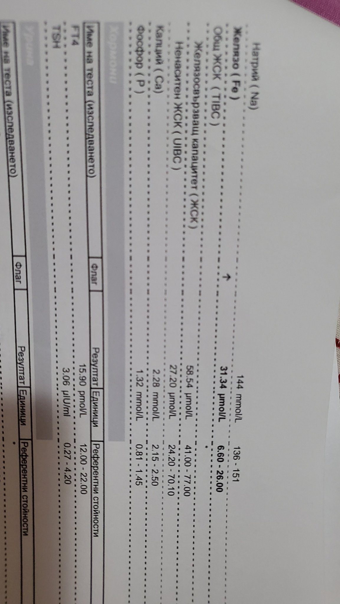 Момичета, вчера си правих и кръвни изследвания и .. желязото ми е 31 и малко при максимално 26, а феритин - 39.80mg/L с реф. 13.00-150.00, трансферин - 2.74g/L при реф. 2.00-3.60.