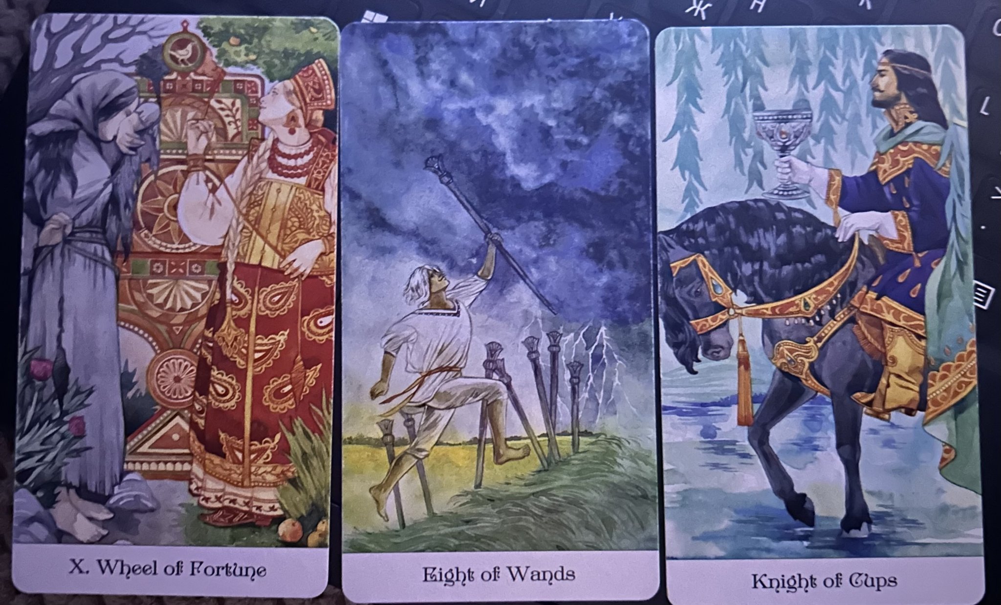 При втори поглед на картите 9 жезли и Рицар жезли може да се проявят и като предоляване на страха/ограничението, защото изглежда Рицарят като да минава през жезлите. Но така запътил се напред към бъдещето, не знам дали не бяга. То ще си стане ясно де.
