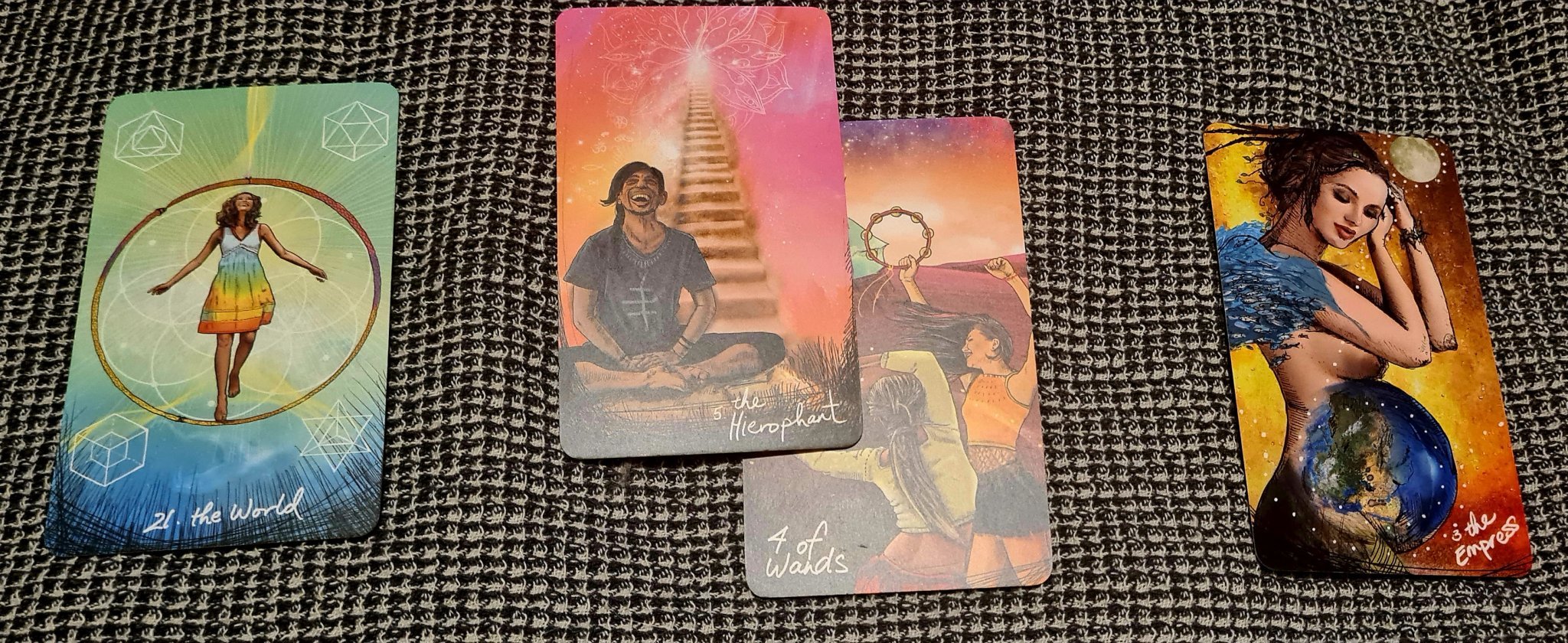 Сборът от номерата на картите е 21 Светът. Това го възприемам като че е настъпил моментът да изчистим кармата в този живот, но някак не го виждам как ще стане.