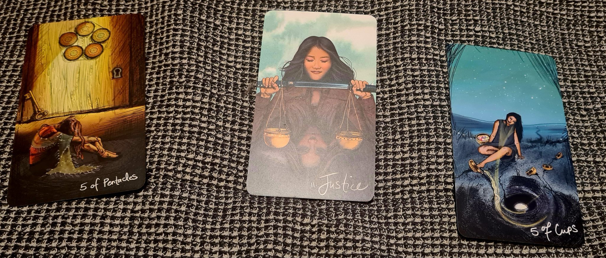 По примера на Twinklestar и аз изтеглих карти с въпроси 1) Какви сме били в предишен живот? 2) Какво са се разбрали душите ни за този живот? И добавих трети въпрос 3) Как ще се разивят отношенията ни в този живот?