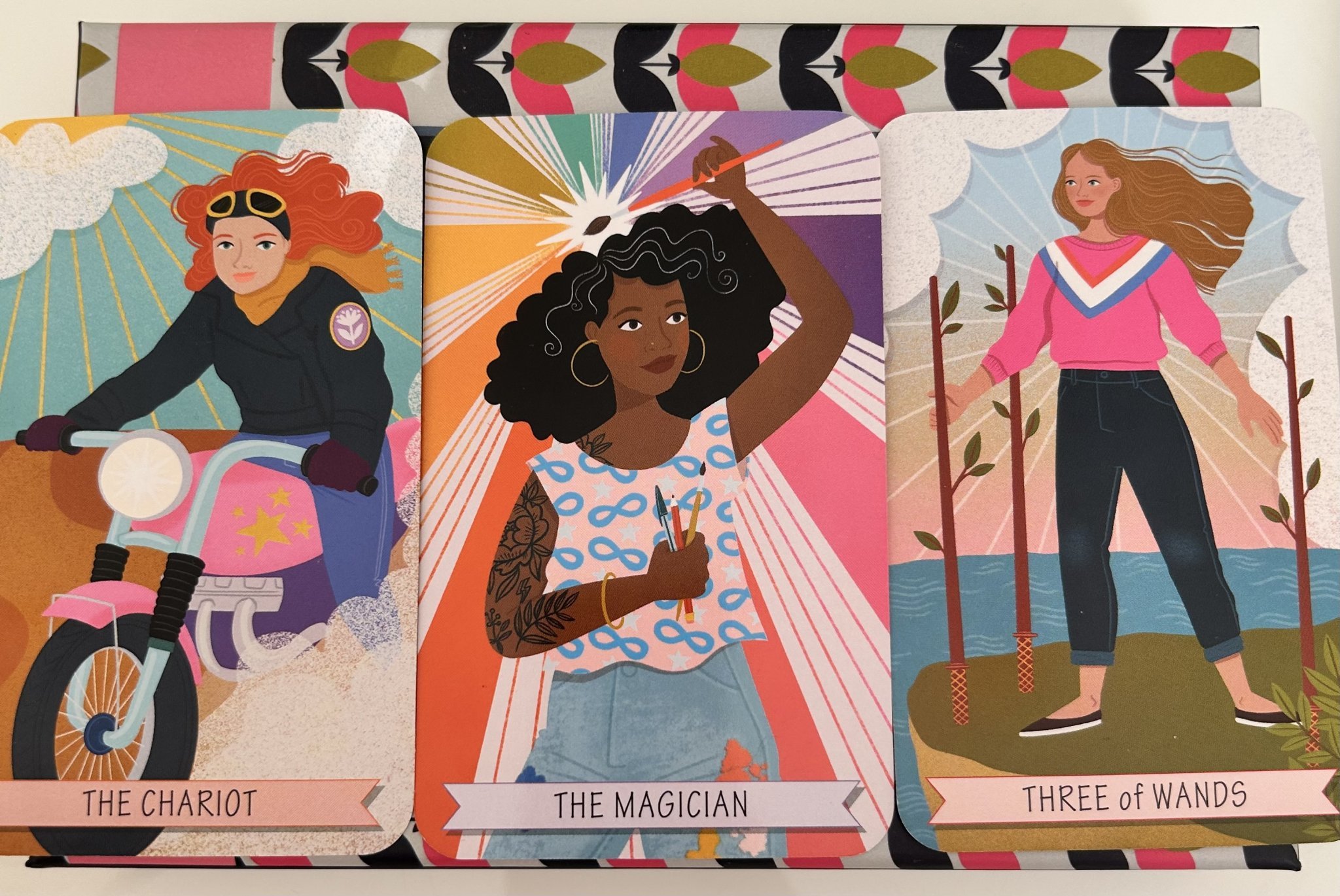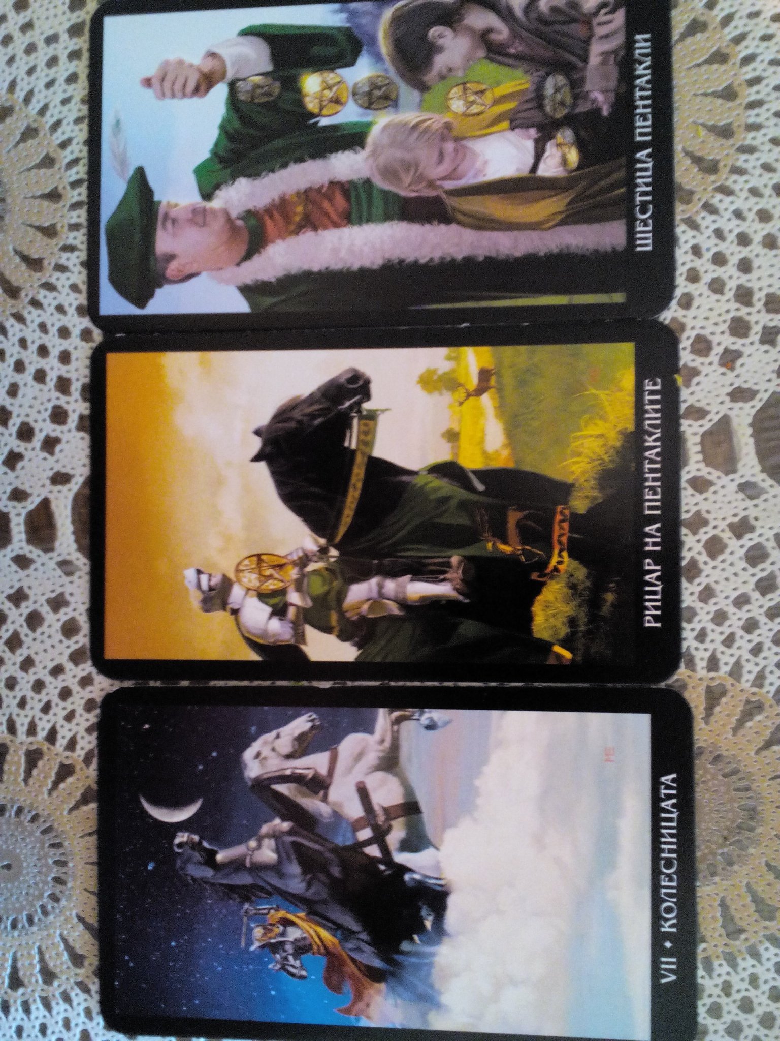 По Колесницата за мен трябва буквално да започне да се движи, по Мага да прояви воля и постоянство и даже мисля, че не ѝ трябва друг човек в смисъл на треньор, а тя сама може да си прави упражнеие вкъщи примерно , но 3 жезли какво е? Или тройка жезли показва резултата?