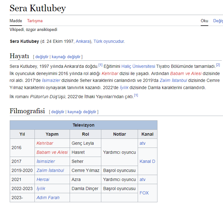 Симпатична много, снима се от 2016 година и има изиграни 6 роли. Последно се е снимала в "İYİLİK" / "Доброта"  и естествено играе лошата, която има връзка с  съпруга на приятелката си /Хатидже Шендил/.