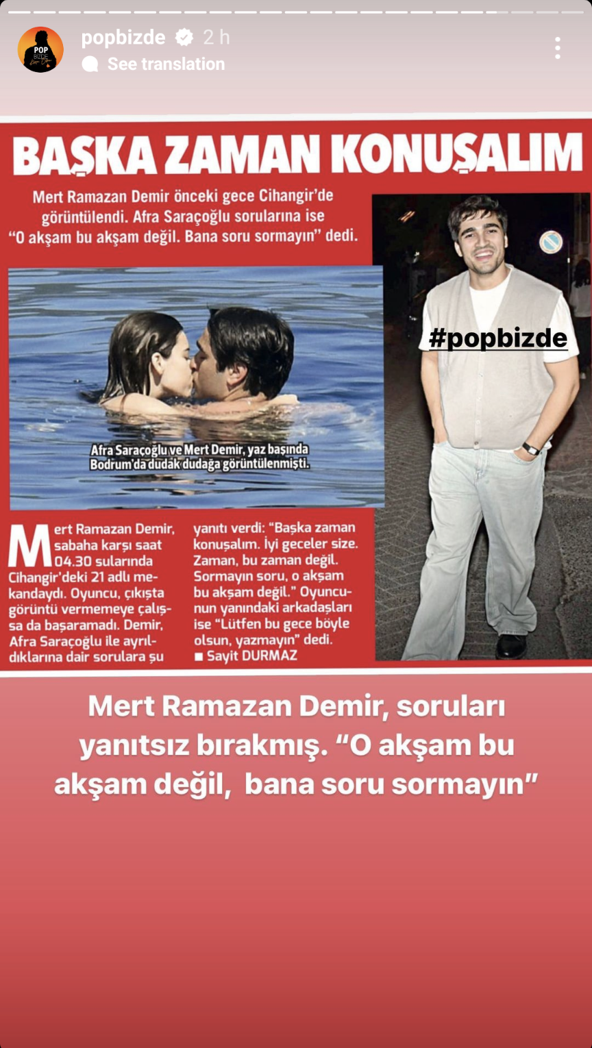 Само по няколко снимки в тъмното и думите на жълтур, който е показал, че недолюбва Мерт и Афра, няма да съдя за ситуацията. Освен на онези кадри в морето жълтурите не успяха да ги хванат никъде заедно и сега са решени да ги притискат по всякакъв начин. Къде блее менджърката му? Или си мисли, че това е добре за бизнеса...