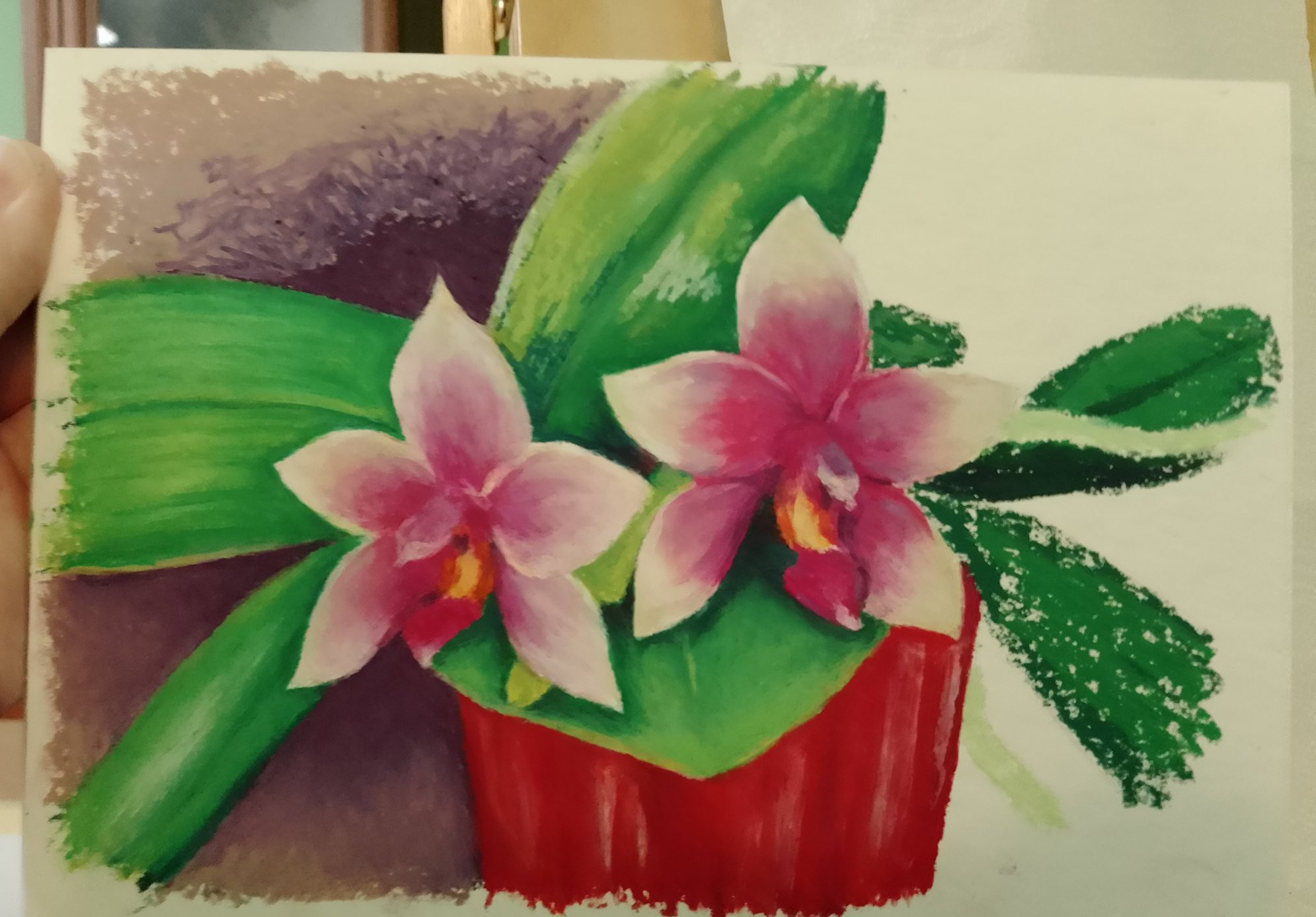 Аз започнах едни орхидейки с маслен пастел, впрочем снимката не е моя, май я взех от темата за орхидеите. Няма да рамкирам или продавам рисунката, само упражнение е, така че дано собственикът на снимката да не се обиди.