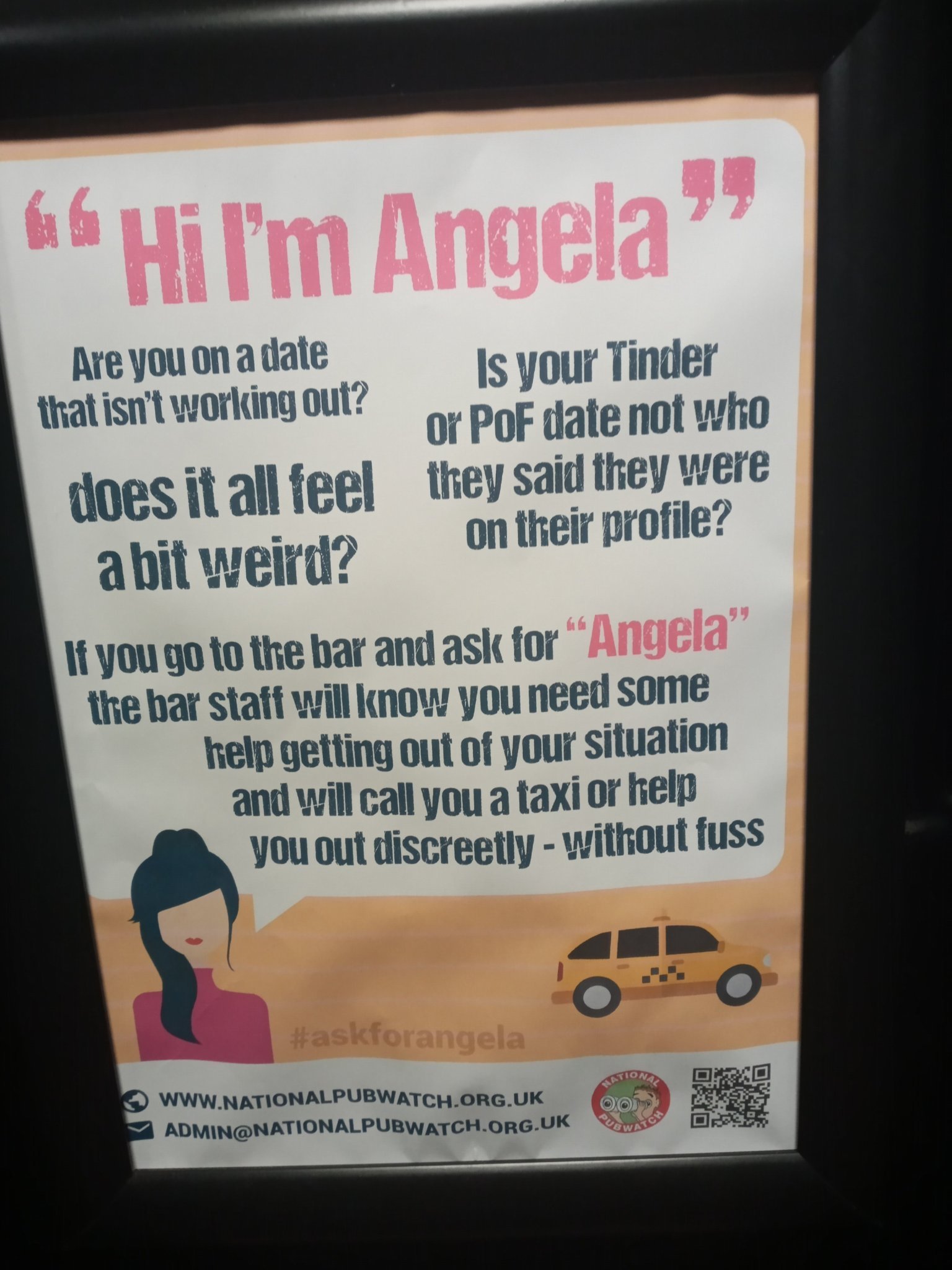 Благодаря, същият курс беше. Ask for Angela -кодова дума, която ако жена каже на персонала, означава, че се чувства застрашена. Персоналът е обучен и реагира веднага.
