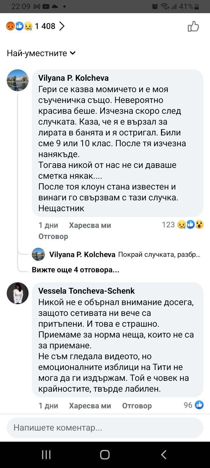 Тоя Тити винаги съм си мислела, че я за психиатрията, гледам да го избягвам, като го засека по тв, а сега още повече се отвратих. Също и не разбирам защо се убиват да канят по предавянията такива лумпени като него, най-желаните гости, голяма забава. Знам, че ще ме изтрият заради "лумпен", ама ..