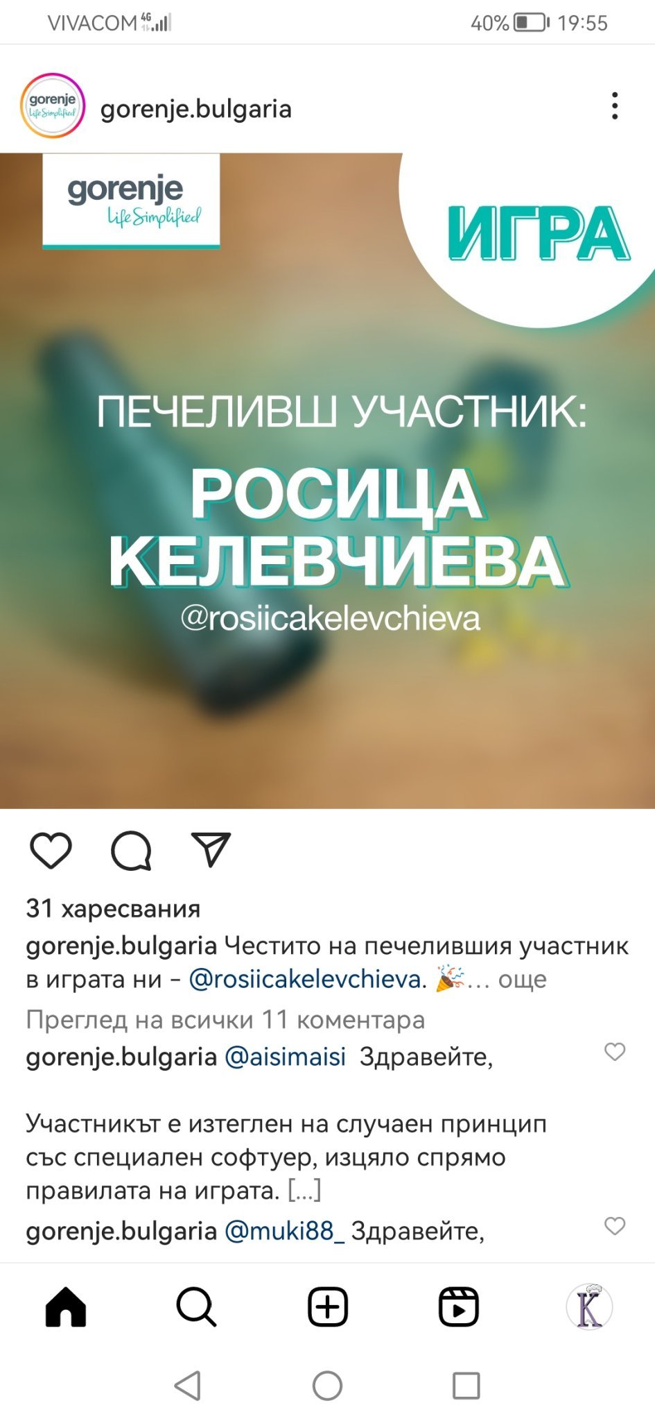 Тази е сложила над 30 коментара , как няма да я изтеглят. Няма нищо лошо в това да коментира няколко пъти - ако иска и 100 човека да тагне- все пак нали са различни хора - проблема е че не е само тя , има и поне 15-20 други , които са инфлуенсъри с над 40-50хил. Последователи , организират игри , пълни са с пари и накрая участват дори и за най-малкото - бутилка вино. Това не е смешно , а е направо трагично. ( В Инстаграм нито влизам,  нито следя тези игри които пускат толкова често , но слушам и чувам едно и също за едни и същи хора как играят и как коментират. )