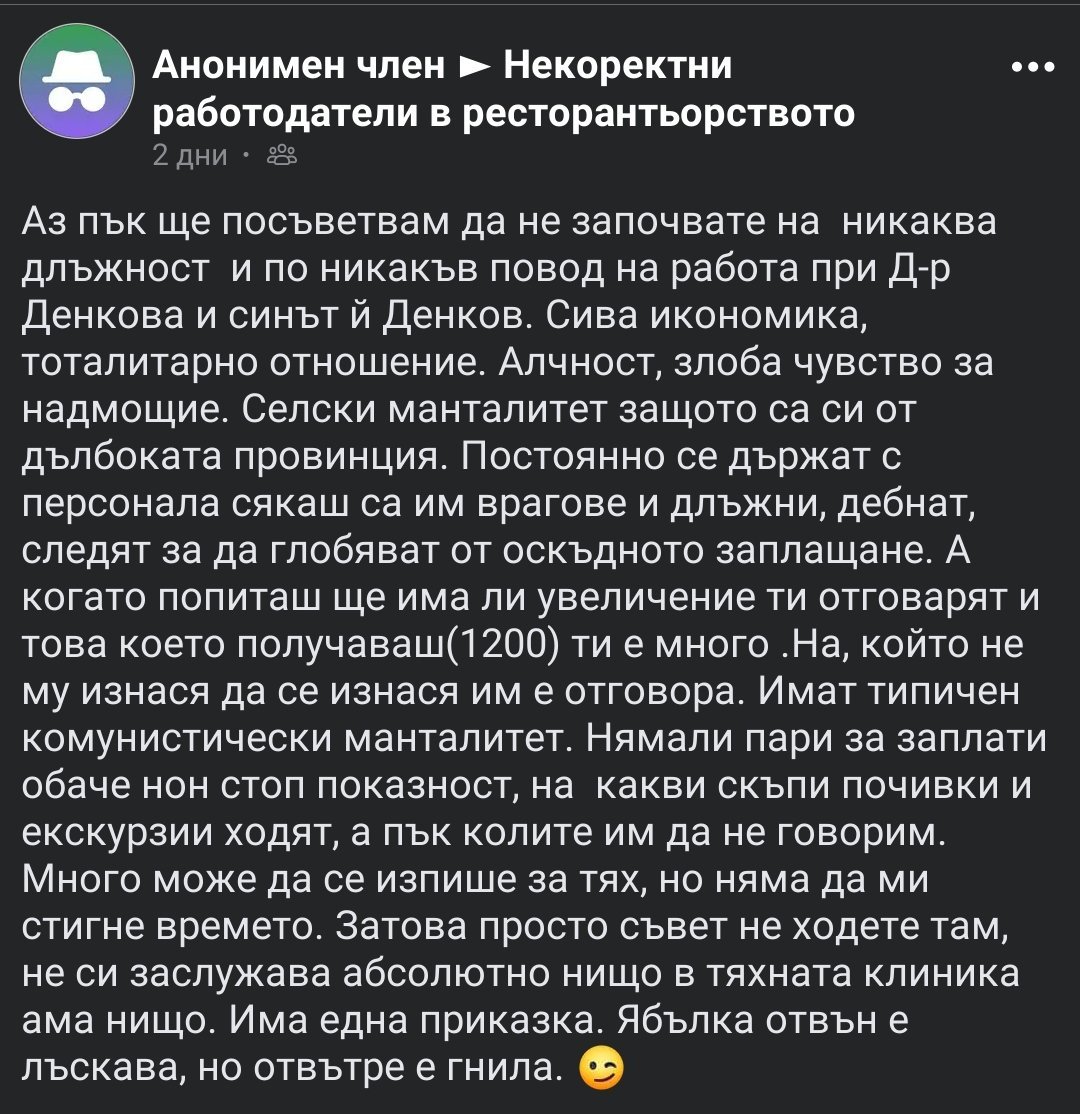 Някой в група за ресторантьори във Фейсбук се е оплакал от Д-р Денкова и син Joy
