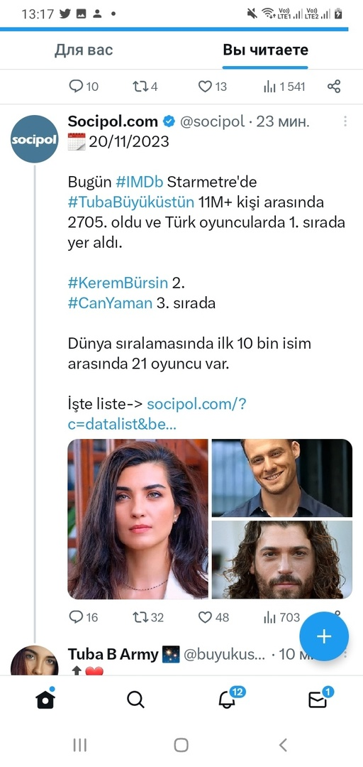 Туба Бююкюстюн е на 1-ва позиция сред турските актьори тази седмица.