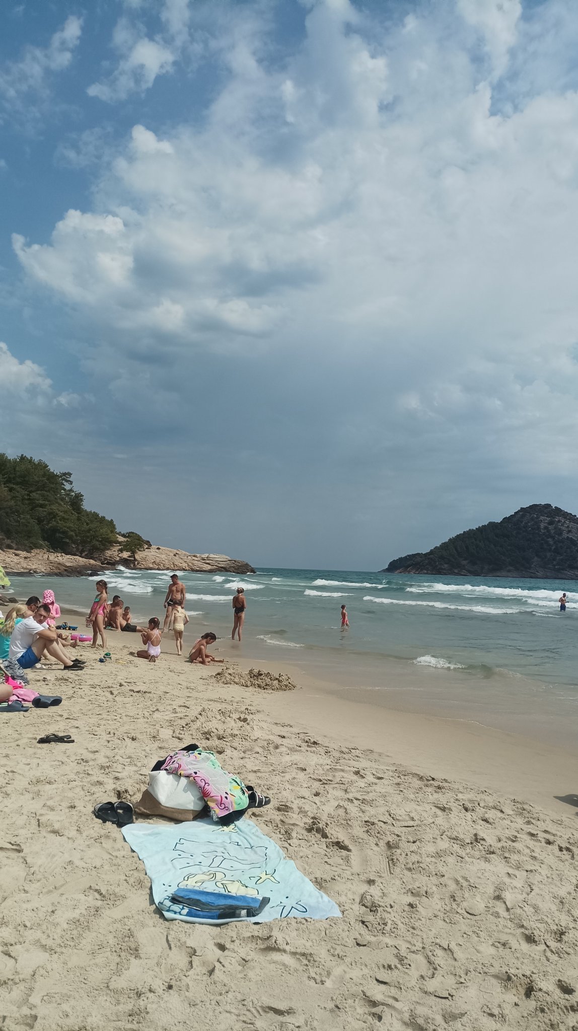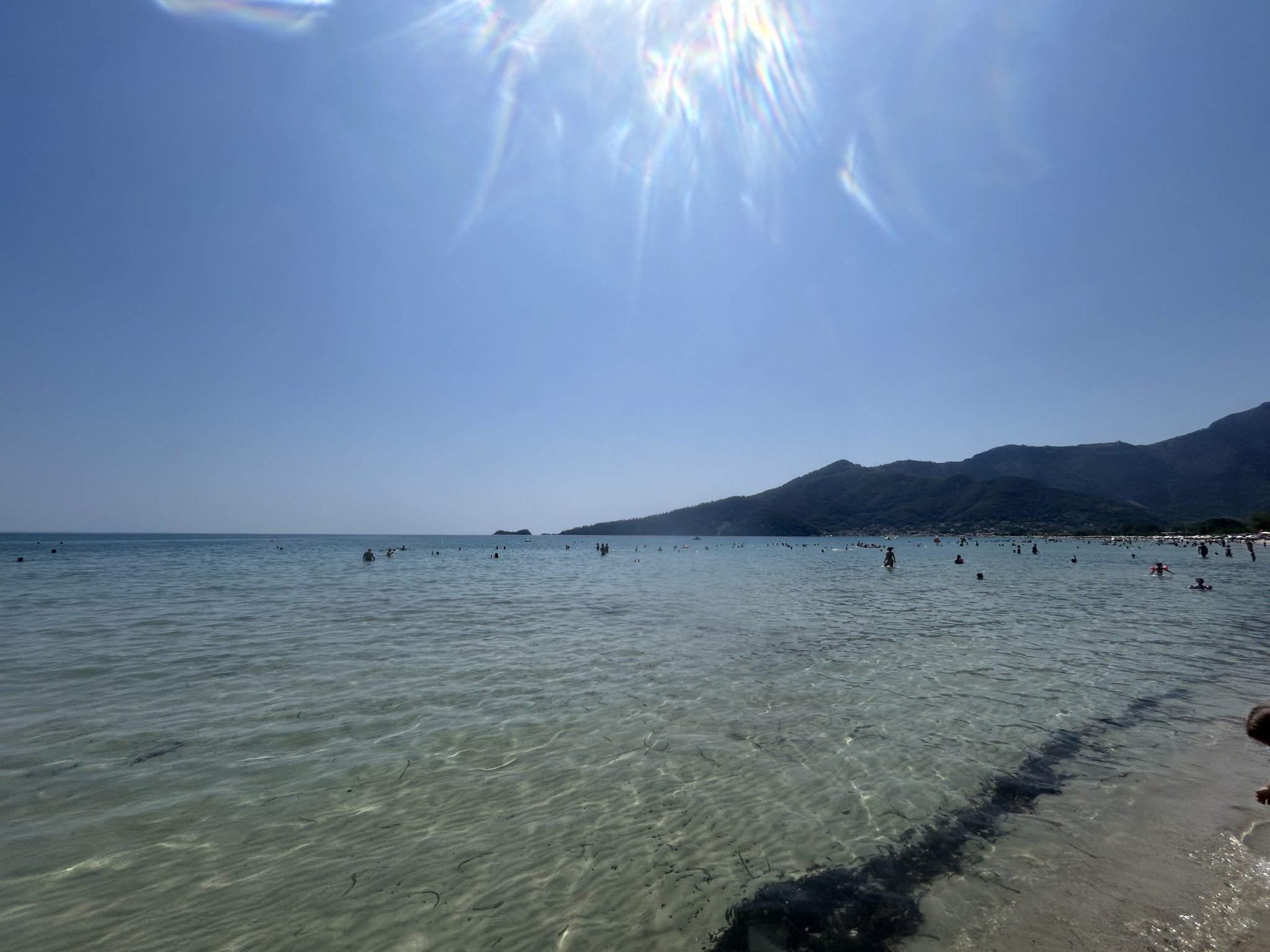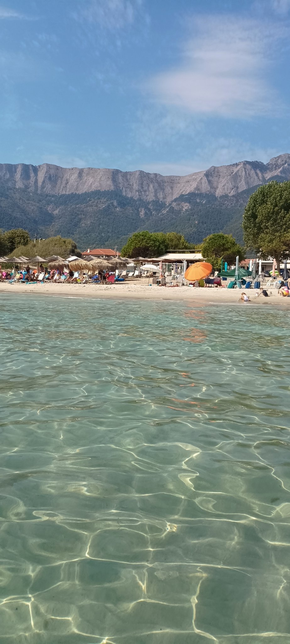 Следобед се размътва водата,заради пясъчното дъно и хората стъпващи по него,или заради вълни.Мраморният плаж,според мен,само за снимки става.Иначе-камъни,неприятно за вървене,дълбоко и студена вода.