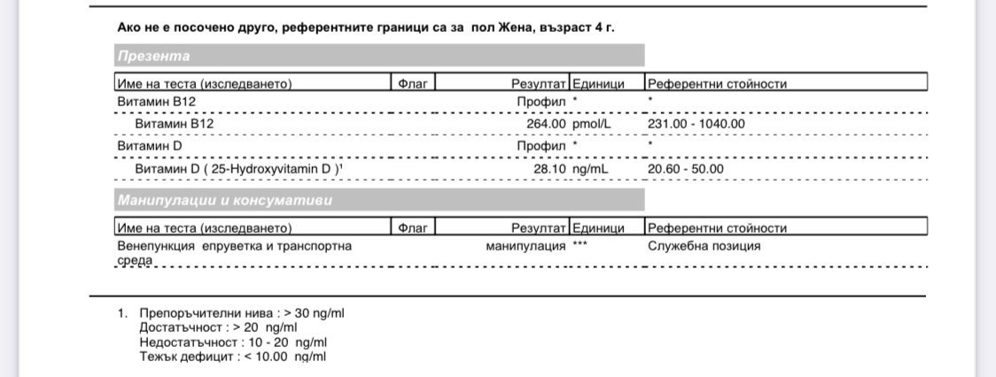 Това са показателите ми на Вит Б12 и Д преди 50 дни. Започнах да приемам Вит Б12 на Солгар -1000 и вит. Д.