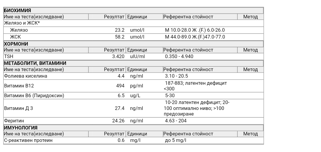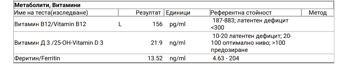 Можеш да повториш като пуснеш и хомоцистеин...можеш даде консултираш и с друг хематолог...аз се консултирам през healee,ако искаш пиши на лични да ти кажа коя е моята хематоложка...мия феритин беше 38 и то в друга мерна единица където горната граница е 150 и хематоложката каза,че е нисък...