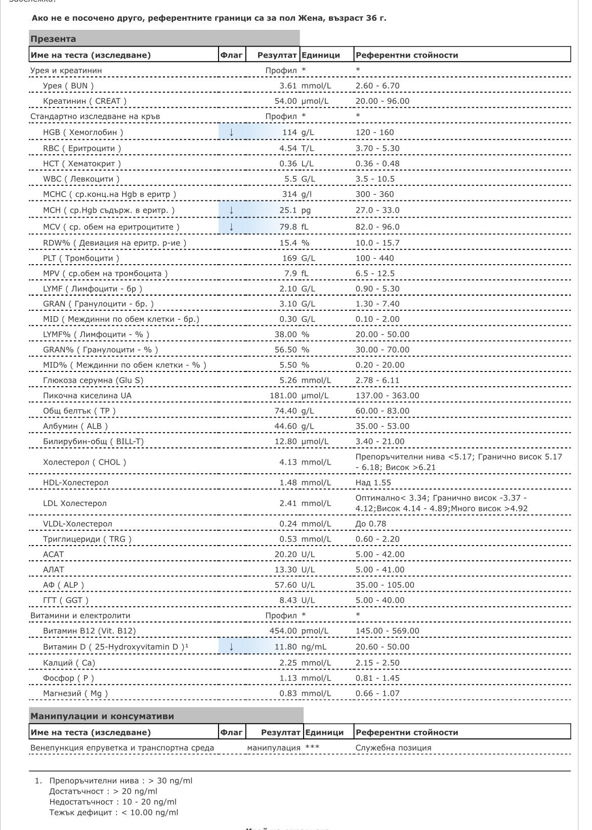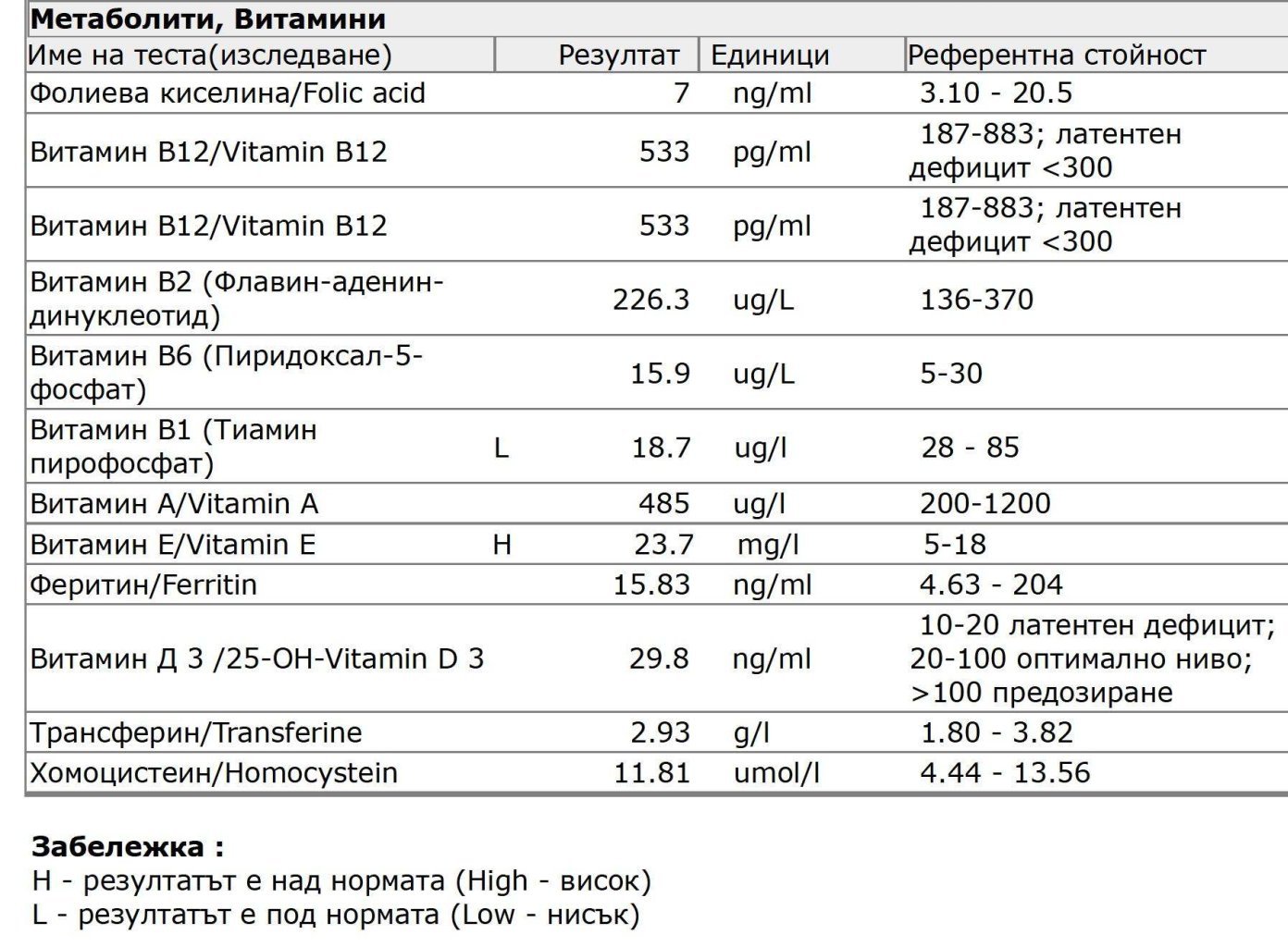 Витамин Д 3 /25-OH-Vitamin D3: 14.9 ng/ml (реф.ст-ти 10-20 латентен дефицит; 20-100 оптимално ниво; >100 предозиране)