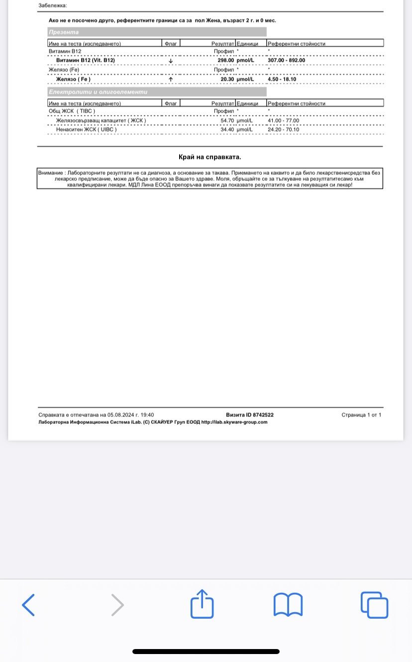Здравейте,имам запитване относно изследвнията на дъщеря ми. Днес пуснахме изследвания за ясла,та реших са пусна В12,Желязо,ЖСК. Принципно винаги хемоглобина и излиза леко над норма,но при всичките ми запитвания към ЛЛ ни е казвала,че не е проблем щом останалите показатели са в нормата. Днес от изследванията излезе,че вит В 12 е под нормата,а желязото е над норма. ЖСК профила е в норма. Хемоглобина леко завишен з възрастта.Предстои да се консултираме с ЛЛ утре следобяд,но до тогава ще се побъркам от притеснение. Всички допълнителни прегелди и изследвания до този момент са правени по моя инициатива. Според лекарката ни съм се вживявала много,та в един вид нищо му няма на детето. Утре ще видим какво ще каже,но предполагам пак,ще е нещп от сорта на “няма и нищо”. Според ЛЛ отклоненията при кръвните показатели били нормални при децата. И все пак имали подобни случаи като нашия? При ниско в12 и високо желязо да изпишат нещо за две годишно дете. Моля и за кординати за добър онлайн детски хематолог,понеже сме от провинцията и искам възможно най-бързо да се консултирам