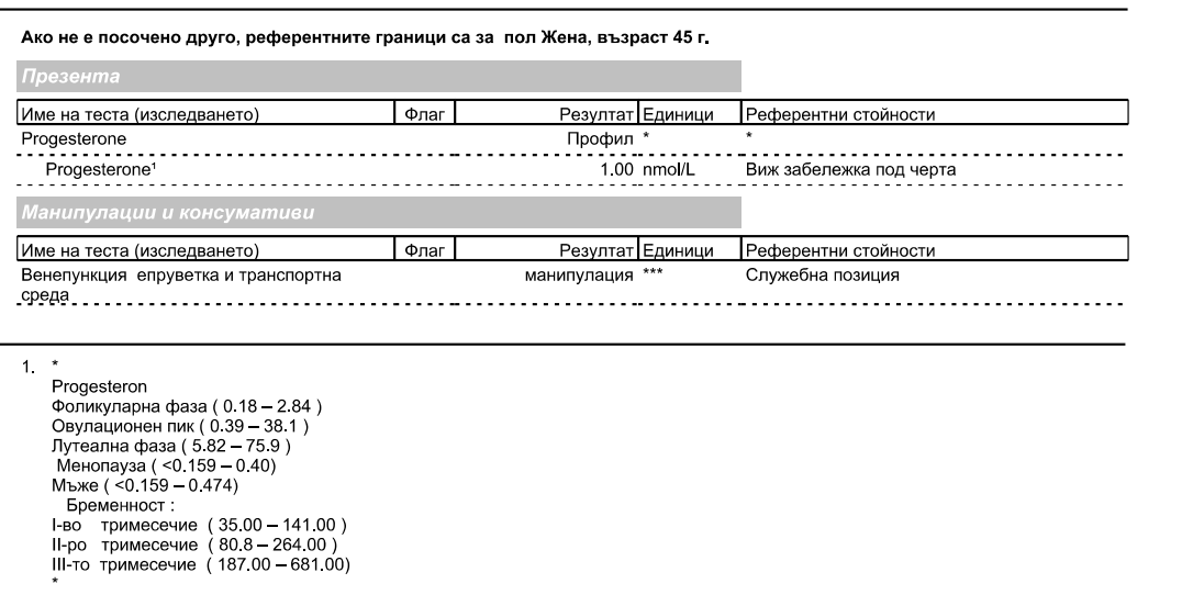 Здравейте! Да питам и тук. На 45г съм, до април тази година приемах противозачатъчни и последния ми цикъл беше в края на април, спрях ги и оттогава нищо. Всъщност през септември имах нещо като зацапване за няколко дни, но не знам дали да го смятам за цикъл. Няколко дни преди това прогестерона ми беше доста нисък - 1. Май месец по друг повод изследвах щитовидните, които са в норма, но май не в оптимални стойности.