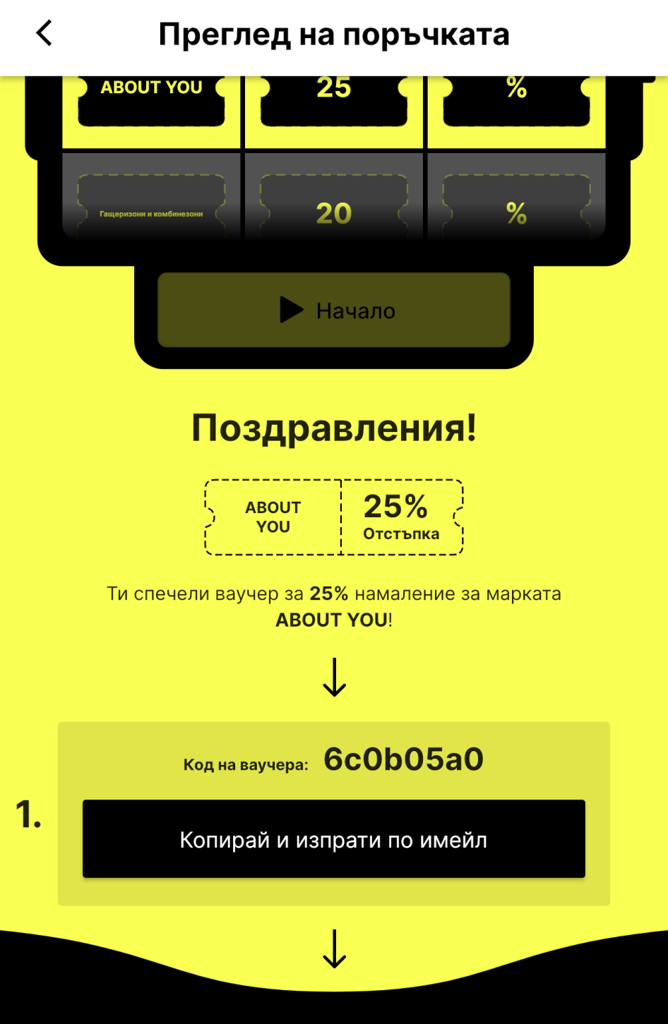 За да върнете продукт към AboutYou, в пакета трябва да има формуляр за връщане с описание на продуктите в пакета и етикет с товарителница. Можете да използвате оригиналната опаковка (кутия или плик), за да върнете артикулите. Поставете артикулите, формуляра за връщане и залепете етикета (товаритеница) върху плика или кутията. След това можете да отнесете пакета в офис на Еконт или да поръчате куриер, който да го вземе от вашия адрес, като се обадите на телефон 07001 7300.