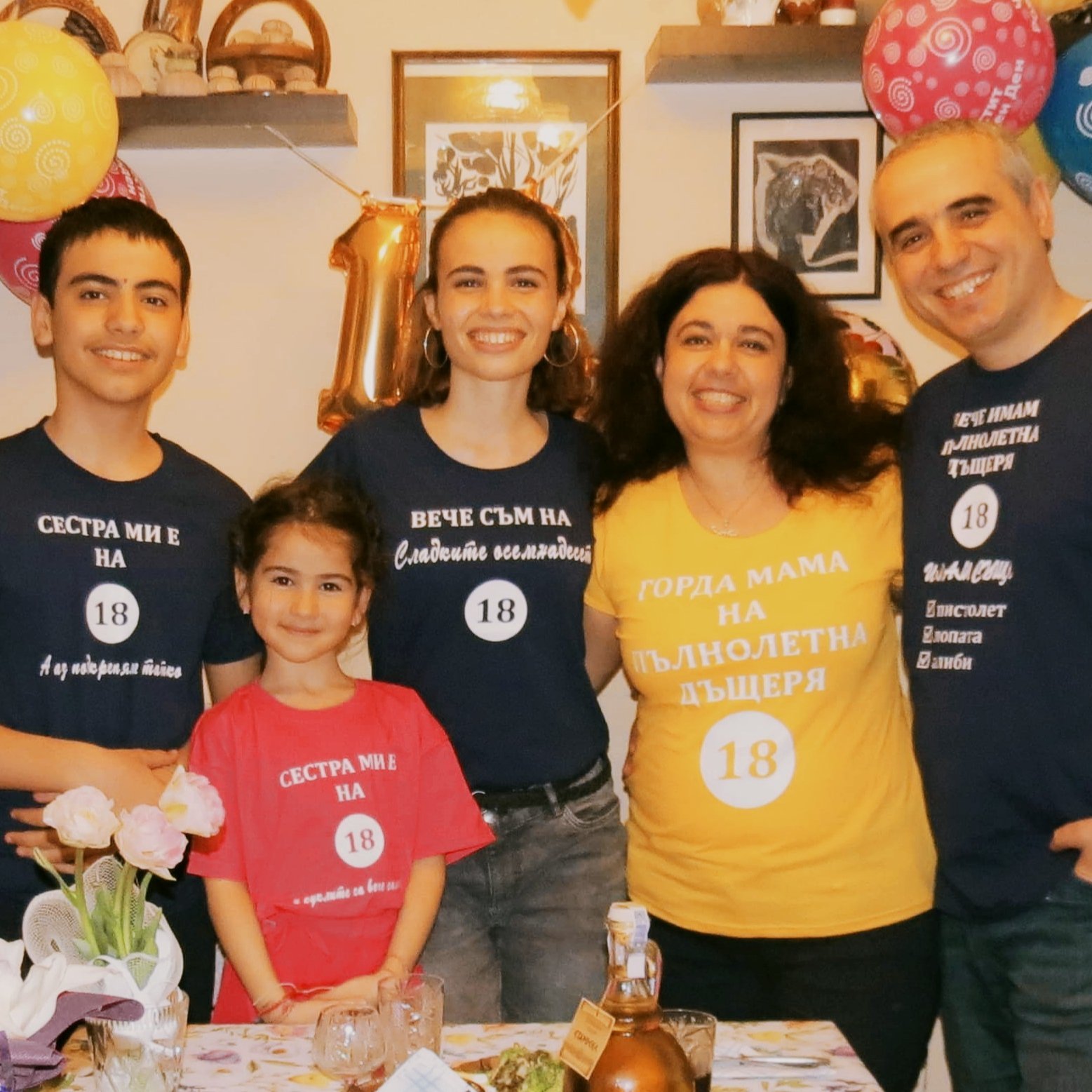 Фло, идеята е на дъщерята. За нейните 18 правихме РД с много изненади, защото беше пандемия и всичко друго беше отменено. По принцип в къщи децата не свързват РД с подаръци от нас - ние осигуряваме доброто изкарване на деня - парти, торта, изненада (нематериална), та и за 18 направихме подобно - балони, торта, тениски за всеки, бяхме претоплили в къщи, така че кято и подарим нейната тениска я накарахме да я пробва и после ние съблякохме суитшъртите и останахме с нашите... Много весело беше. И на после тя предложи да направим такива за отбелязването на 20-те години брак, но цветовете да са същите като на сватбения ни ден за всеки участник. Кумовете пък дойдоха с питка, букет и бъклица булка да взимат, та това са емоции, които трябва да си причиняваме!