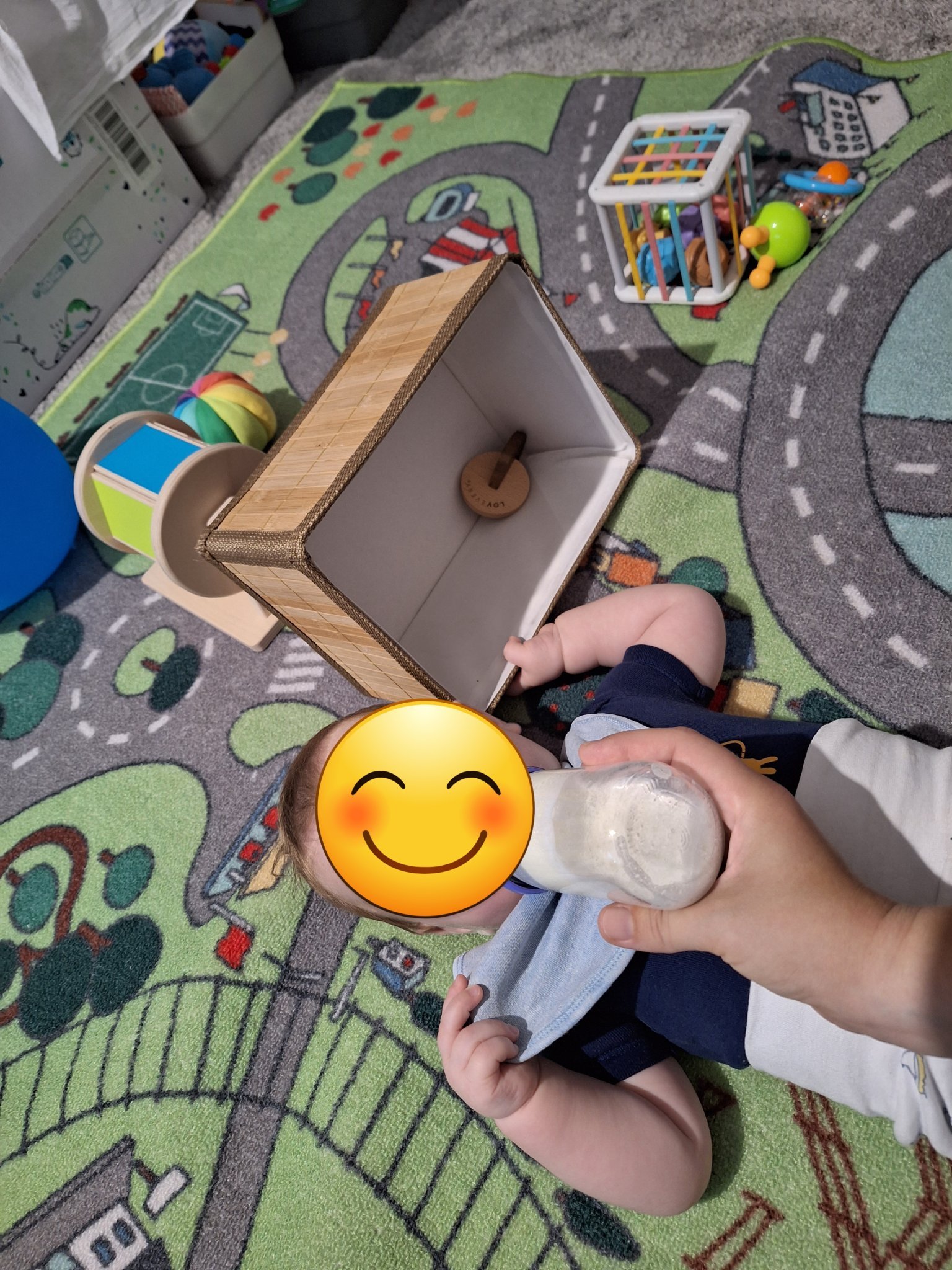 И не съвсем в този ред на мисли - каквото и да чета за развитие , сензорни играчки, ала бала - от известно време сутрин слагам няколко играчки в една кутия и му ги давам - и това са играчките за деня - е след първите десетина минути вадене, гризане и мятане единствената и най-интересна играчка остава кутията 😆😆 ей така си я държи дори по време на хранене 😄