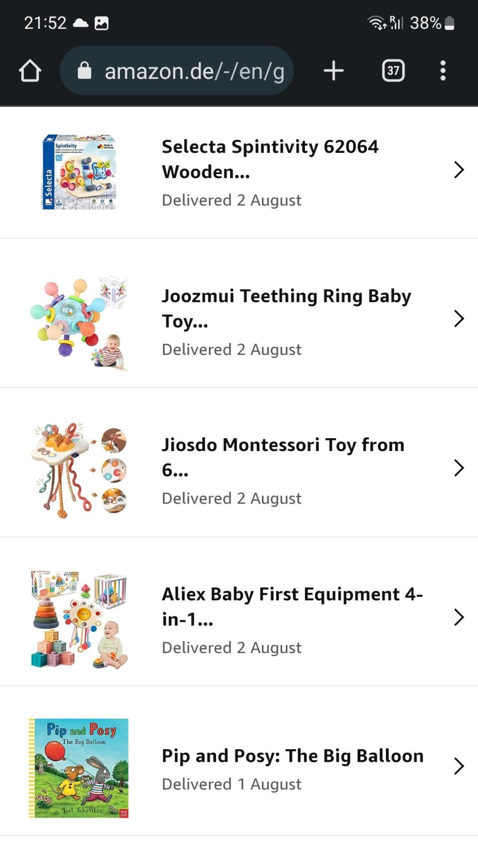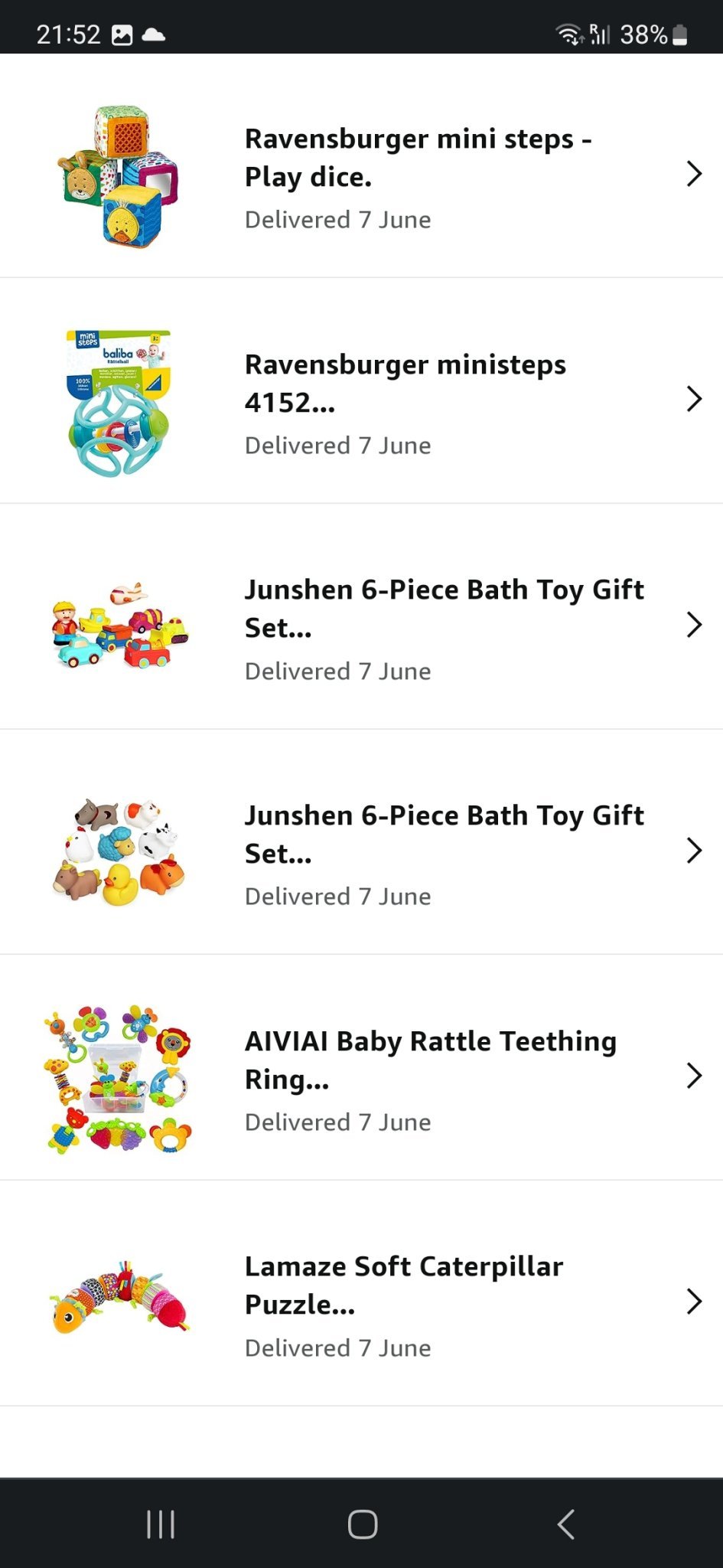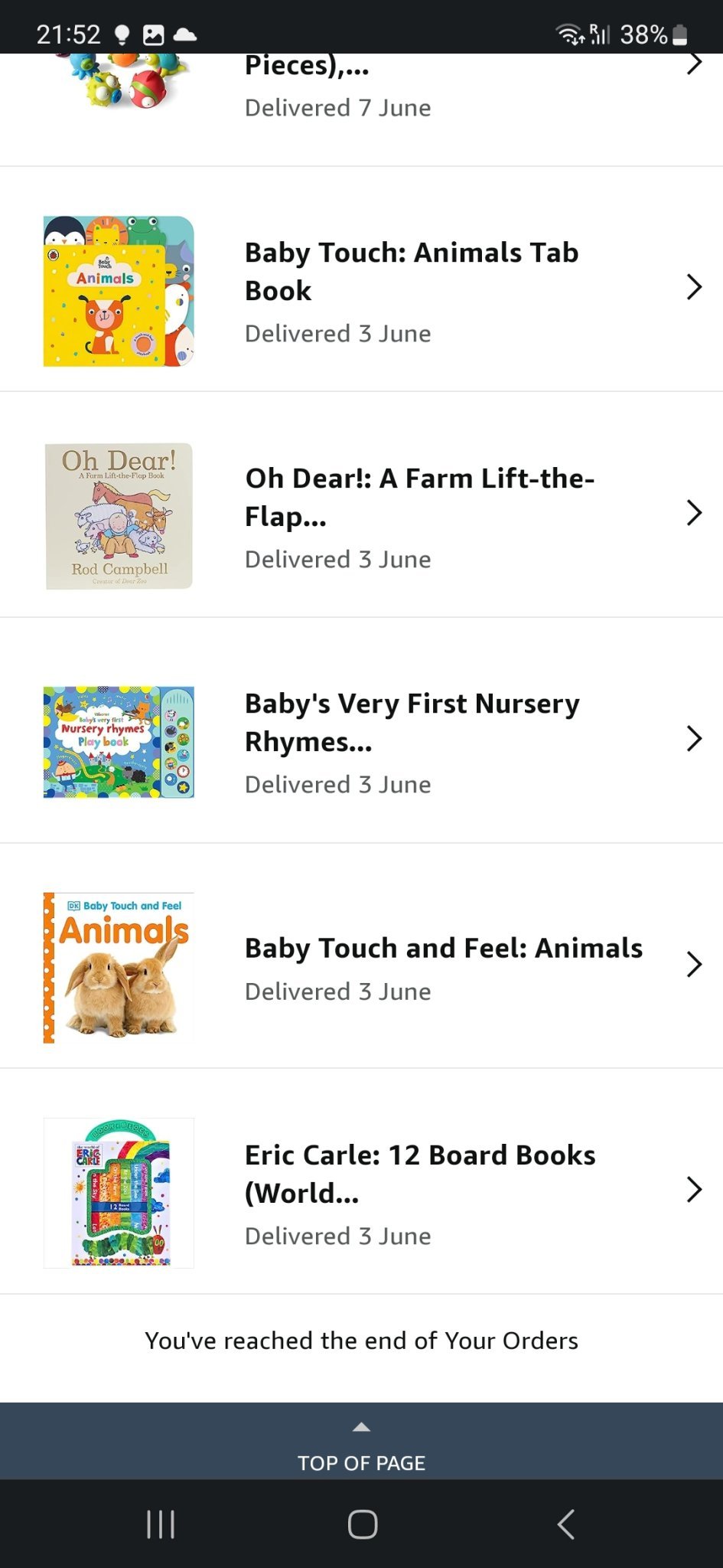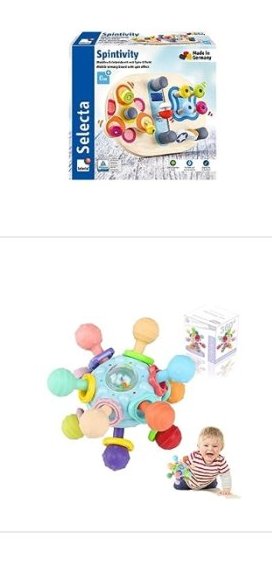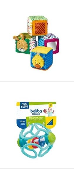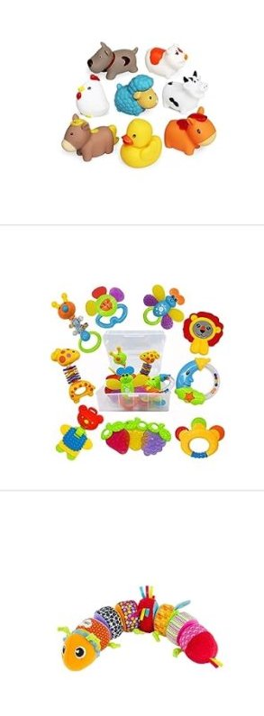 В интерес на истината всички са поръчвани от амазон, като гледам да могат да се перат/мият лесно, да не са прекалено скъпи, да могат да се закачат евентуално, и в абсолютноникакъв случайда нямат батерии 😄😆 (т.е. никакви святкащи и пеещи).  Добавям и някои книжки - едната има релефни елементи и малкият обожава да ги "дращи" - първата от скрийншота - с животинките. Едната по грешка всъщност е с батерии и мелодии, но на всяка страница има и думичките на съответната песничка и така ги пеем (обикновено сутрин докато имам нерви 🙈🙈) - но тя също е сензорна - и нея много обича да я дващи и човърка - все повече забелязва малките елементи (има вълна на овцете, портички в страниците за мишките, улейчета за пътя на пеперудки и охлювчета- изобщо на сляпо я взех, но голям хит се оказа)