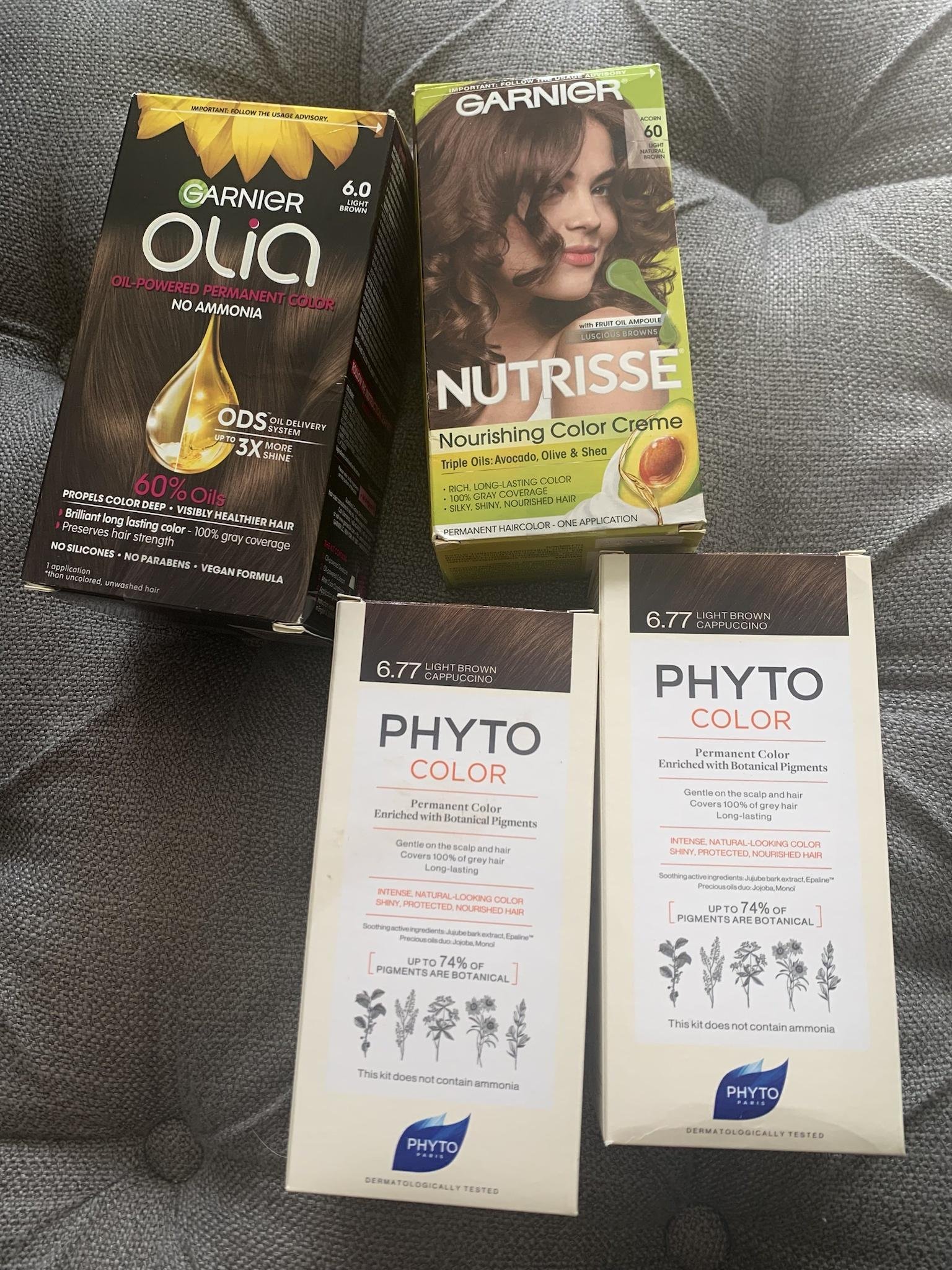 Стари кутии от бои,които вече не ползвам. От както минах на Madison Reed боите,други вече не купувам,но ако видя Фито на разпродажба,бих си взела отново цвят 6.77. Щади косата, цвета е покривен(макар,че за сиви коси има какво да се желае), не ухае на тежката химия и амоняк.
