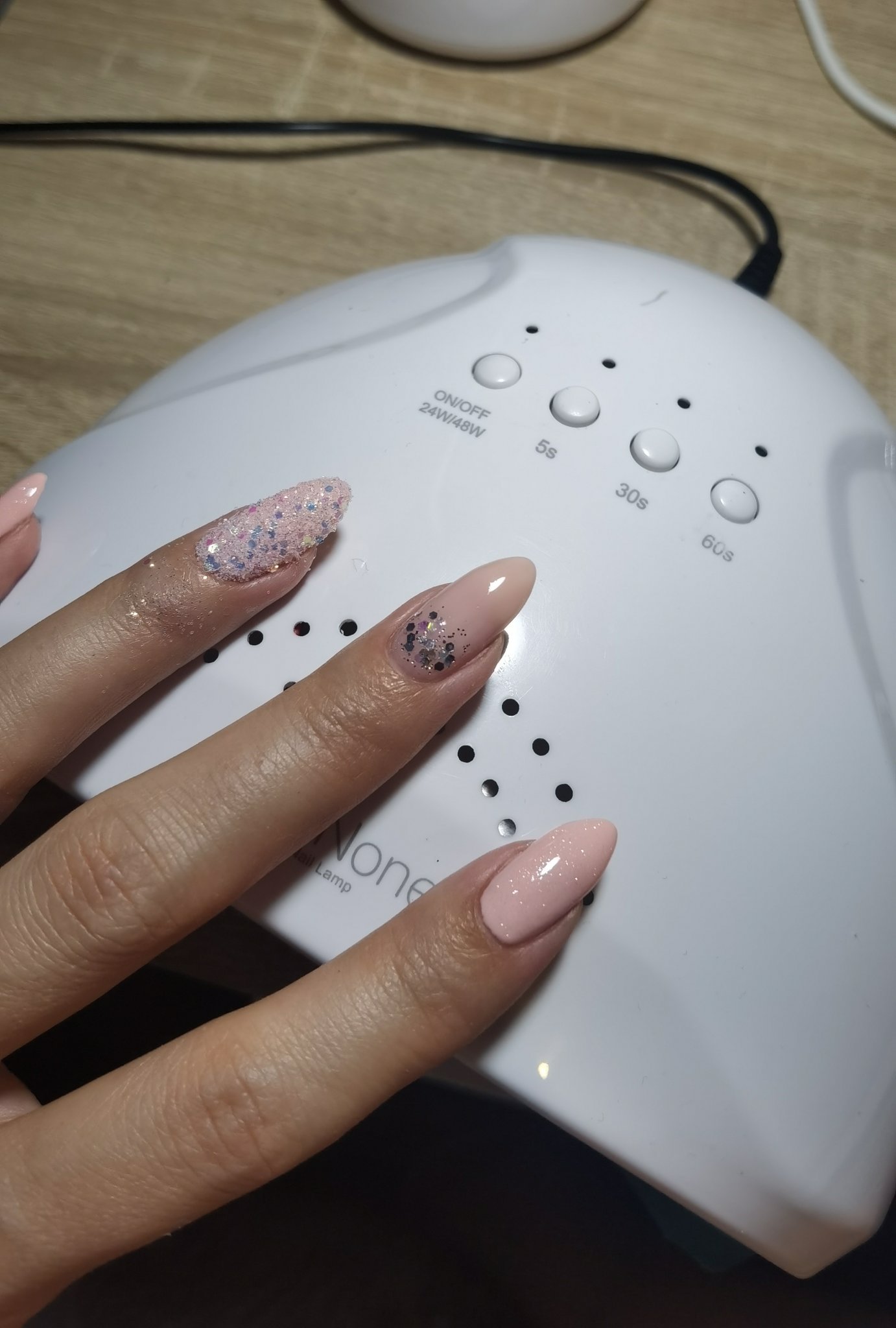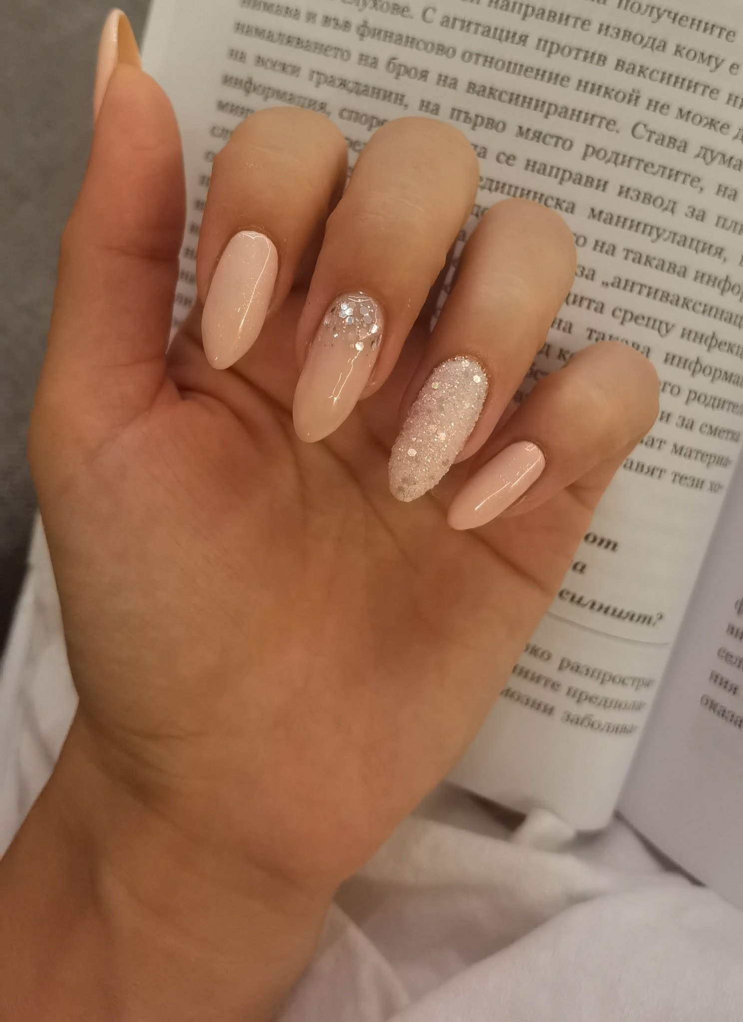 Аз имам една млечна база на Палу, страшно течна, разлива се при укрепване на нокът... Иначе е много красив цвят, с бляскави частици.