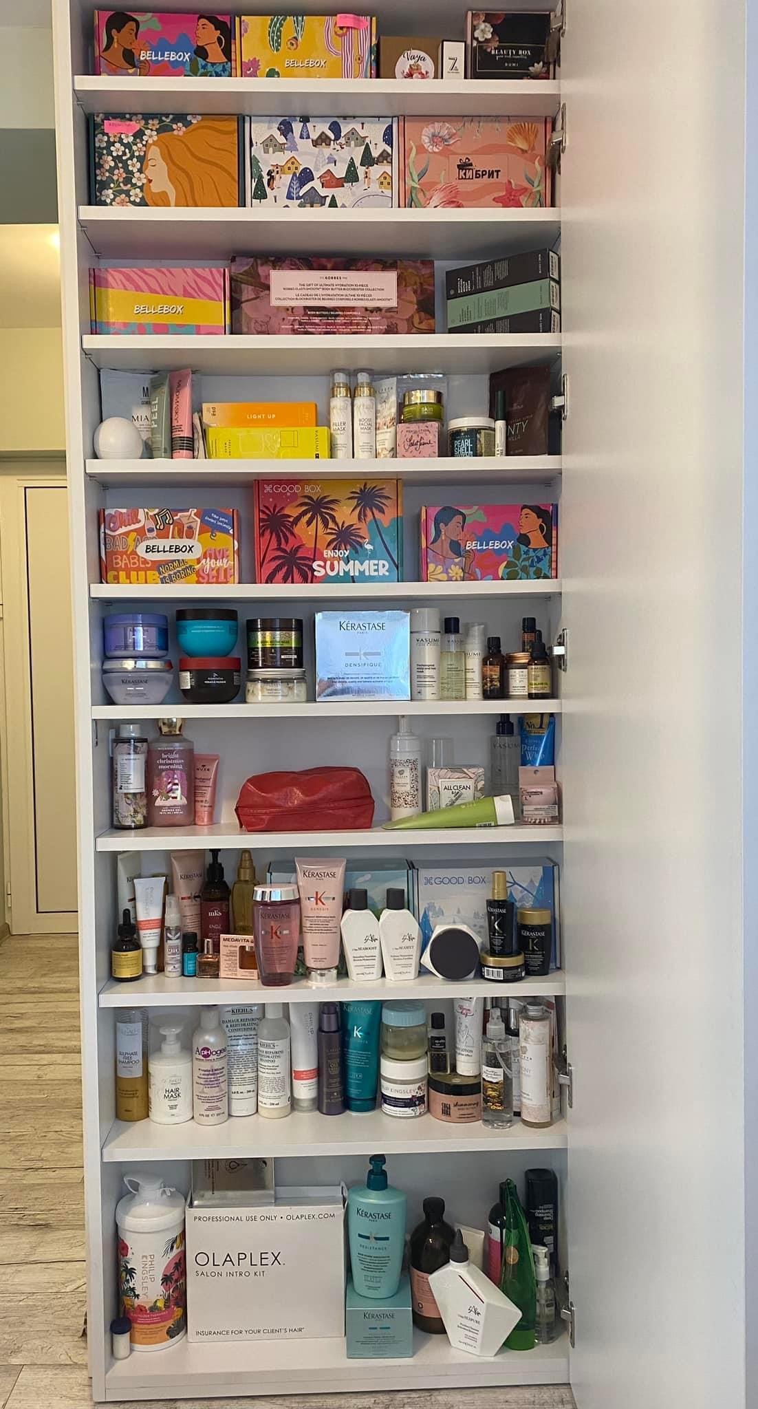 Това е моят шкаф с по- голямата част от козметиката ми. Тези, които ползвам най- често пък са в банята, кутиите не са за украса- също са пълни🤷🏻♀.