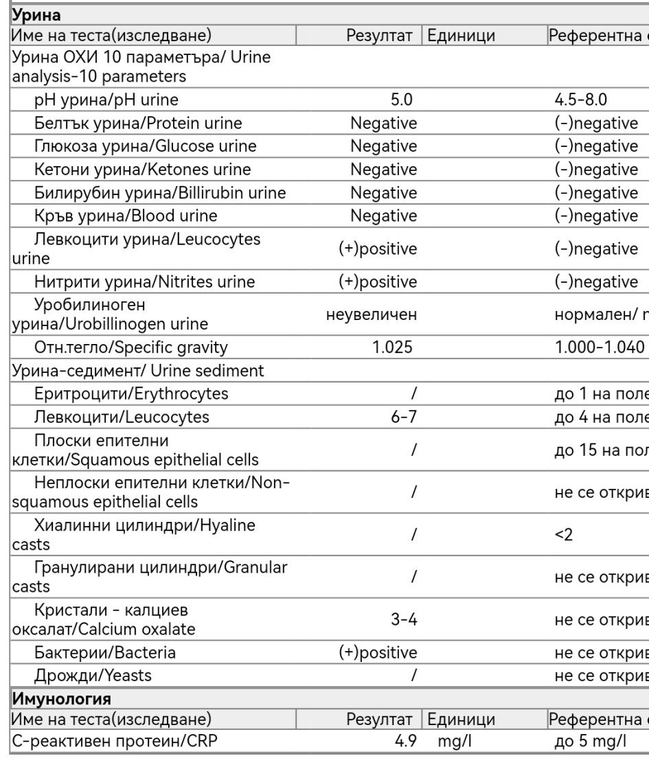 Вече се чудя какво да правя. Иначе левкоцитите са по-ниски отпреди влизането ми в болница. Тогава бяха 12-14 на поле, а сега са 6-7. Но CRP ми беше 3.6,а сега е на границата 4.9. Чудя се дали да не отида на уролог. Нефрологът вече няколко пъти каза, че не вижда никакъв проблем с бъбреците. Какво ще ме посъветвате? За нефроложката има часове чак за 29.09., а за уролог за 18.09. Хемоглобинът още не ми е излязъл, да видим и там какво съм надробила.