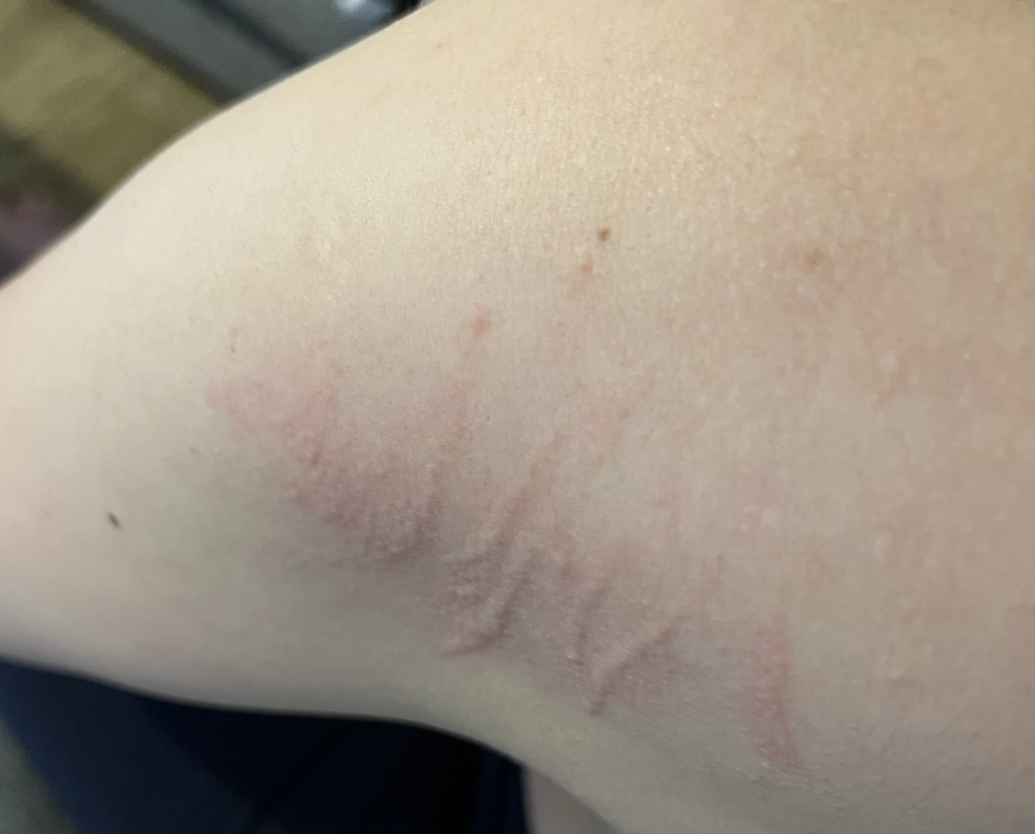 Става въпрос за изразен дермографизъм. Това е свръх реакция на кожата по типа на уртикарията  към допир и натиск. Лекува се с лекарства от групата на антихистаминните. Но е добре да се консултирате с алерголог.