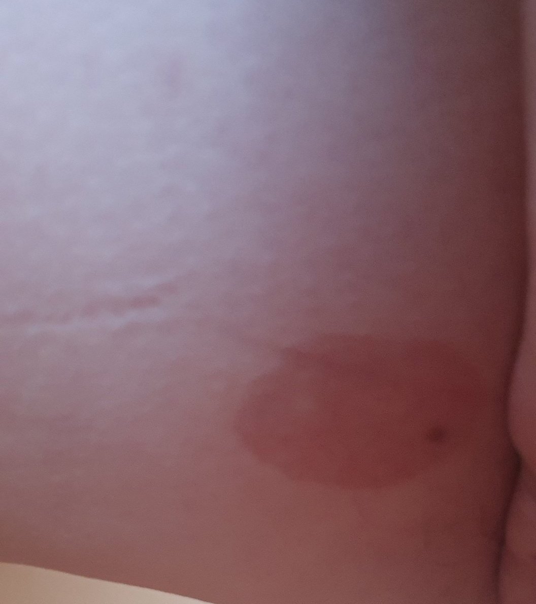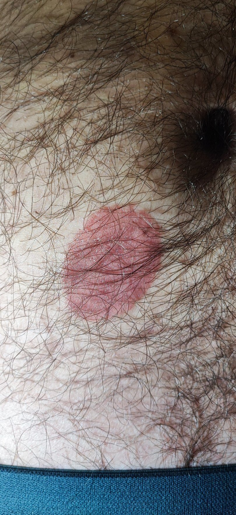 По-долу прилагам изображение на червено петно, което излезе на корема на съпруга ми преди 3 дни - не се разпространява като розов лишей, няма мехурчета като херпес зостер, няма развитие, само го сърби.