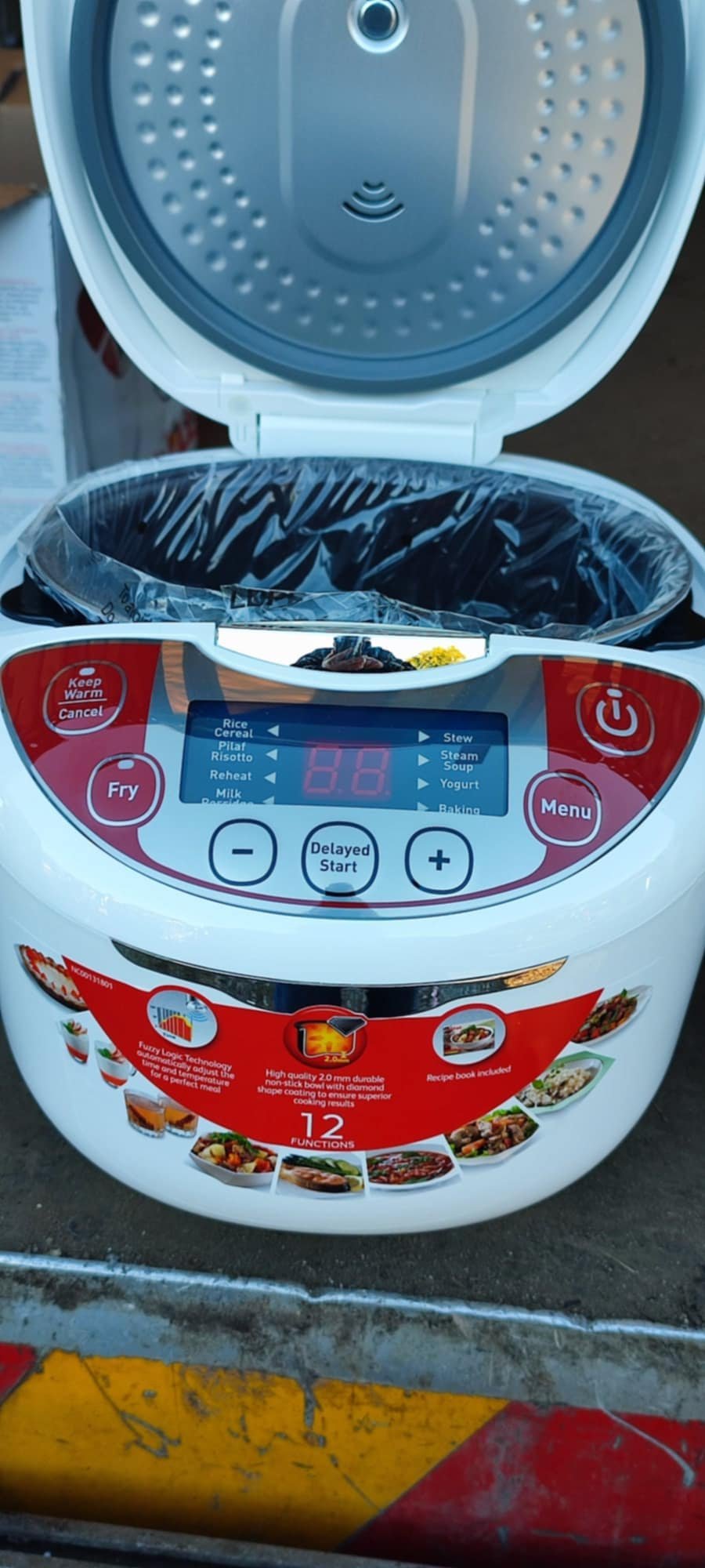 Може да го заредиш сутринта и да програмираш да е готово за 12.30ч, примерно. Купата е към 5 литрова и готви без проблем и за 10 и 12 човека.