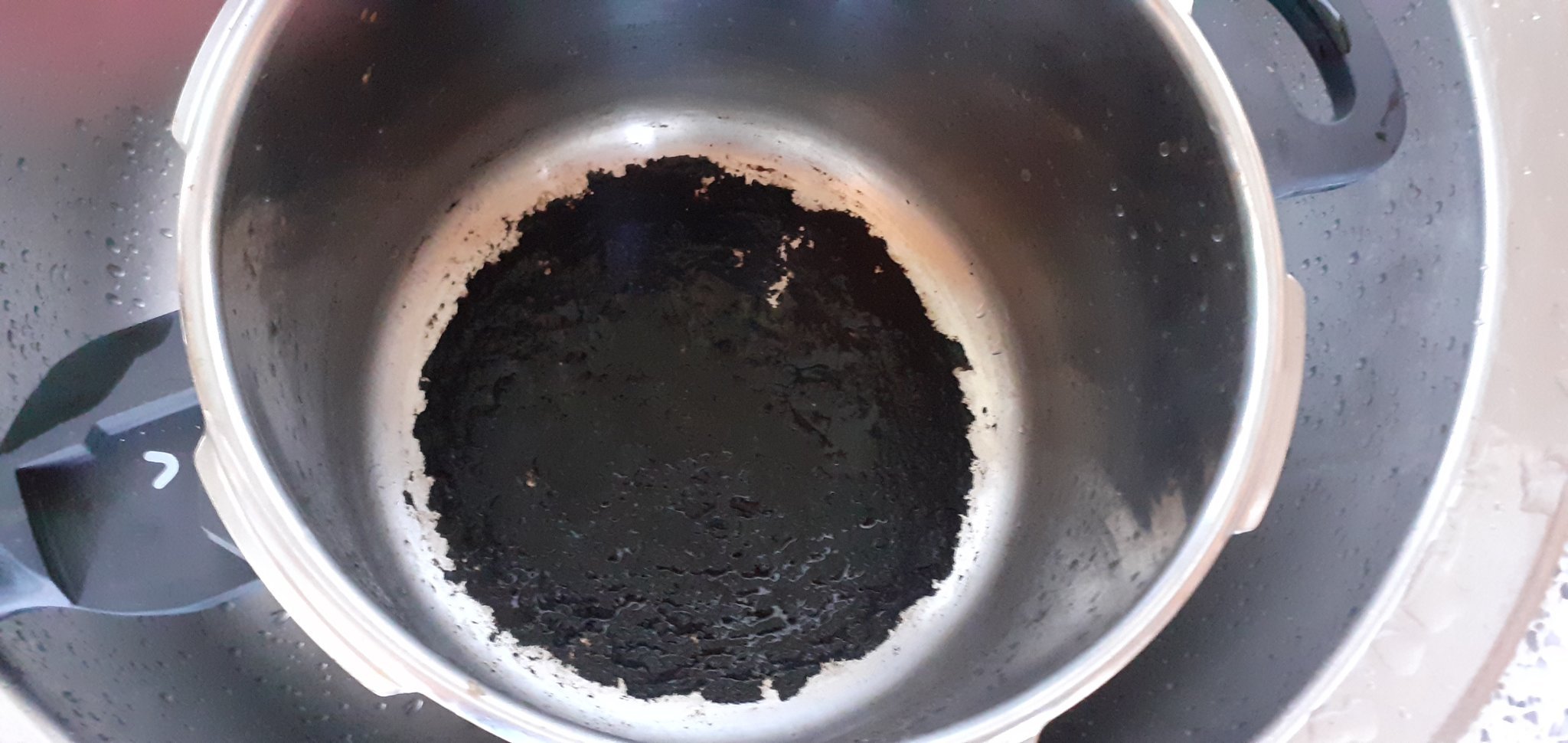 На снимката вече е пускана с оцет и вода няколко пъти, с добавяна сода веднъж и трита с метална тел. Сега е в миялната със Sun extra power. Стискайте палци, че ако не се измие напълно, ще трябва да я облепвам с амоняк и да я опаковам в найлон да не изветрява, както и да я чакам поне 12 часа! Такова изгаряне, с 1см черно, в мултикукър не е възможно.
