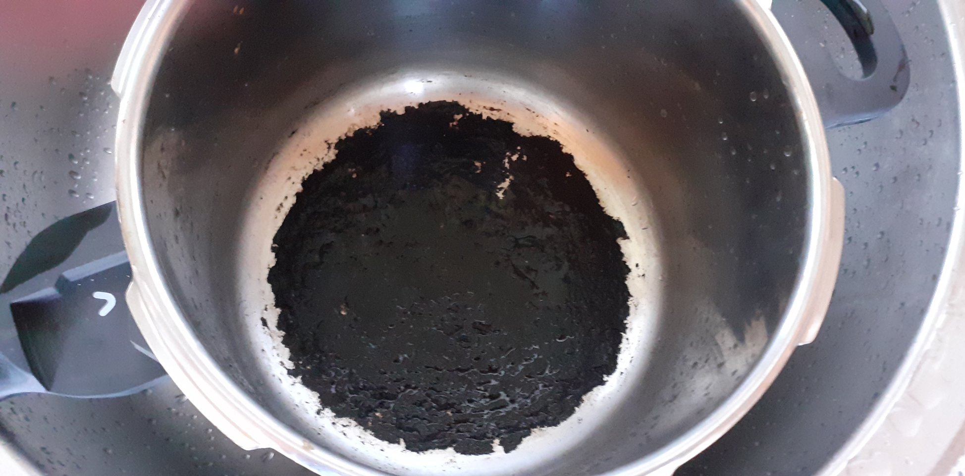 Вчера писах, че загорих зверски експрес тенджерата на газов котлон и помолих да ми стискайте палци. Сварих малко вода със супена лъжица оцет и махнах каквото мога с тел. Остана: