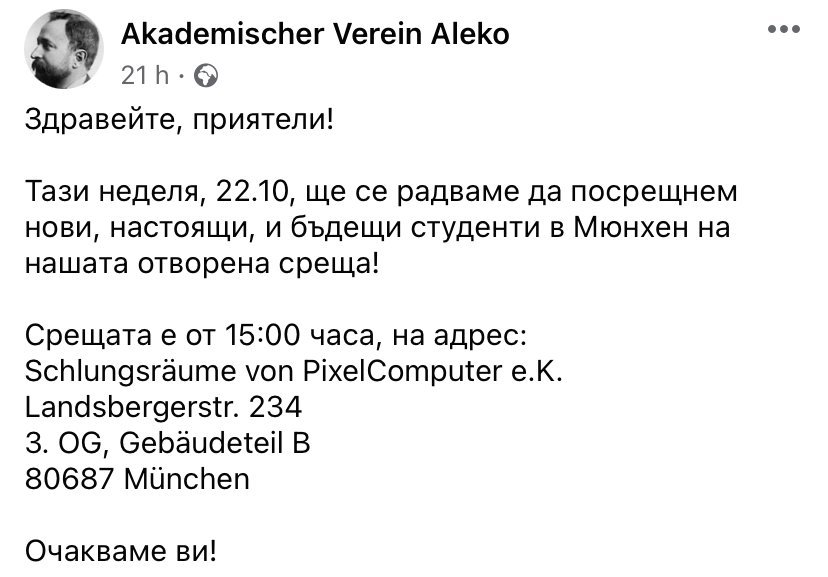 Направи ми впечатление, че академичното дружество в Мюнхен утре организира среща. Доколкото знам от дъщеря ми, срещата си заслужава, ако човек иска да намери контакт с по-опитни студенти, особено от техническите специалности на ТУМ или медицина. За интересуващите се ето час и място: