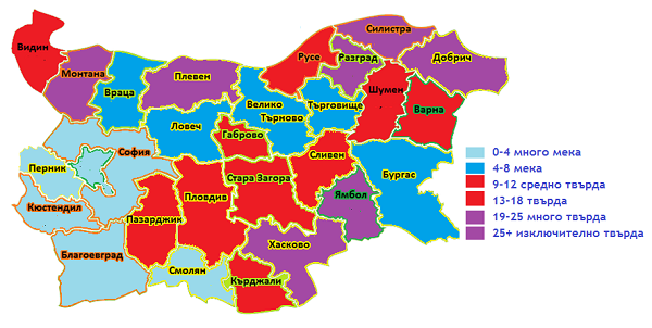 Ето една карта на България с твърдост на водата по райони в същата единица. В някои части на България попринцип си се пие такава вода, каквото е по твърдост мюнхенската чешмяна...