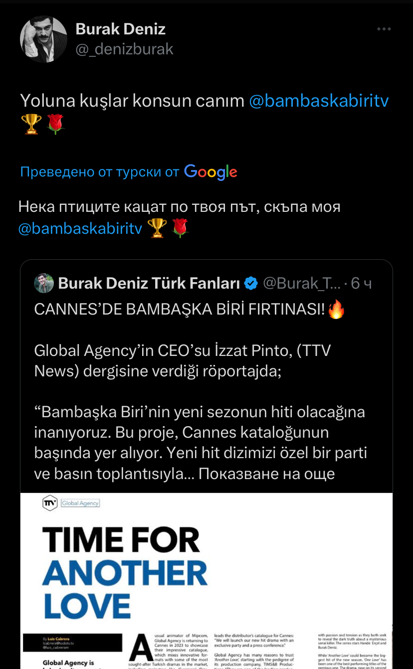 Бурак и Ханде се завърнаха от Кан, където представиха успешно “Друг човек”. На пресконференцията и двамата споделиха, че през последните 7 години са имали за цел да имат втори съвместен проект след “Любовта не разбира от думи” и са чакали подходящият момент и проект. И двамата не скриха, че е удоволствие да работят заедно и всичко е някак по-лесно, когато го правят заедно. Бурак сподели, че на моменти се чувства тъжен от критиките на хората, но дали това ще рефлектира на работата му? - НЕ!