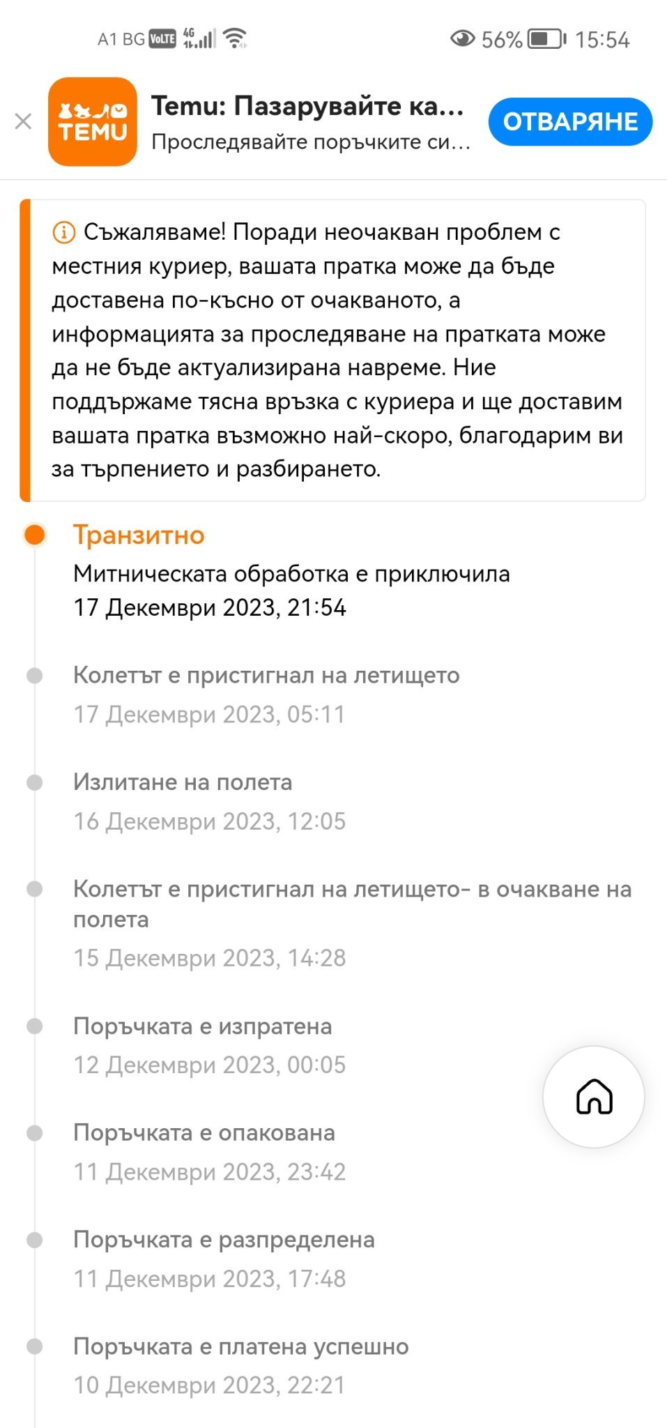 От 02 декември пишеше, че е минала митница. На 14.12 ми излезна съобщение , че е в Благоевград . На 16 ми звъннаха, че са на адрес, но я пренасочих в офис,защото не бяхме вкъщи. Днес си я взех от офис.