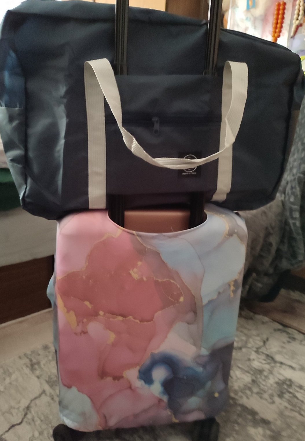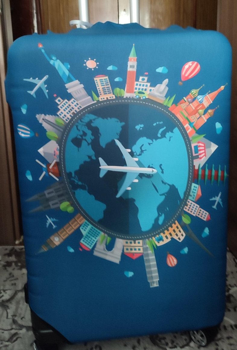 Калъфа за куфар е размер S даже идва малко голям за куфарчето за ръчен багаж, но моето е от най малките. Беще на цена под 12лв. Материята и шевовете са прилични. Като материя не отстъпва на калъфите които съм купувала от другаде  на четворна цена.Чантата за ръчен багаж също е прилична за цена под 4 лв.