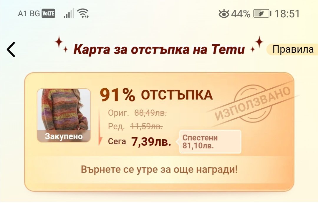 Днес си харесах една блуза и я сложих в кошницата. Малко по-късно я извадих. След още някое време гледам 2 съобщения за промоции. С едното съобщение ми направиха специално намаление и купих блузата за 7 лв. и нещо. С други думи, системата "следи" и предлага според търсенето. Все едно съм на пазара и се чудя дали да купя и продавачът ме навива, като сваля цената. Е, не е много отстъпката (4,20 лв.), но ме навиха. Grinning
