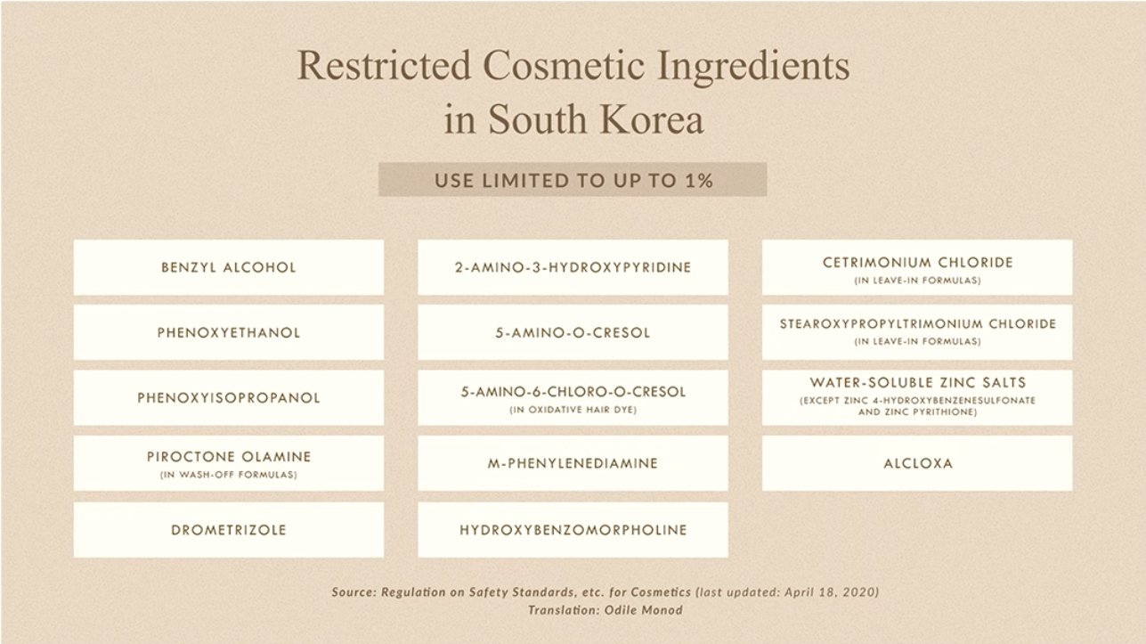 И регулациите са различни. Например в Корея употребата на феноксиетанол в козметиката е ограничена до концентрация 1%, така че всяка съставка, която е след него, е под 1%.  Също всичко след parfume/fragrance е под 1%.