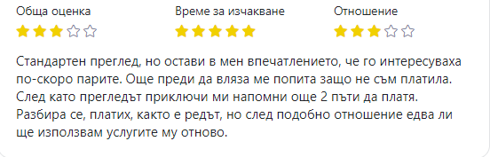 Според мен масово си пишат отзивите сами. 1-2 пъти съм си записвала час през приложението, ами лекарите нямаха нищо общо с “оценките”, че даже едната - д-р Миглена Друмева беше забравила да ми изпрати резултатите от изследванията и се наложи 5 пъти да й звъня за да я подсетя, да не коментирам, че и лечението изобщо не ми помогна.