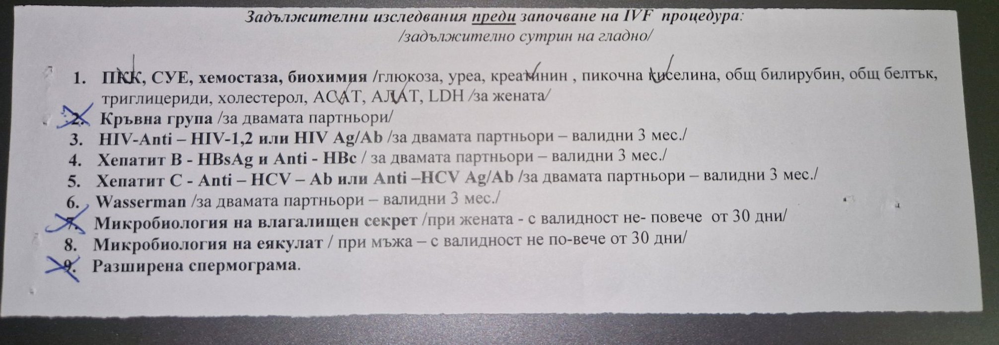 Дадоха ни лист с изследвания. Едните с валидност 1 месец, другите с валидност 3 месеца. Около 300 лв излизат. Правихме ги, не стартирахме, заради задържан фоликул. Наревах се и се прибрах. Няколко месеца по-късно нови изследвания и вече стартиране на опита.