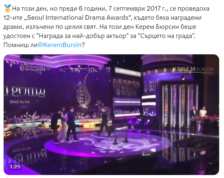 На този ден Керем Бюрсин беше удостоен с "Награда за най-добър актьор" за "Сърцето на града".