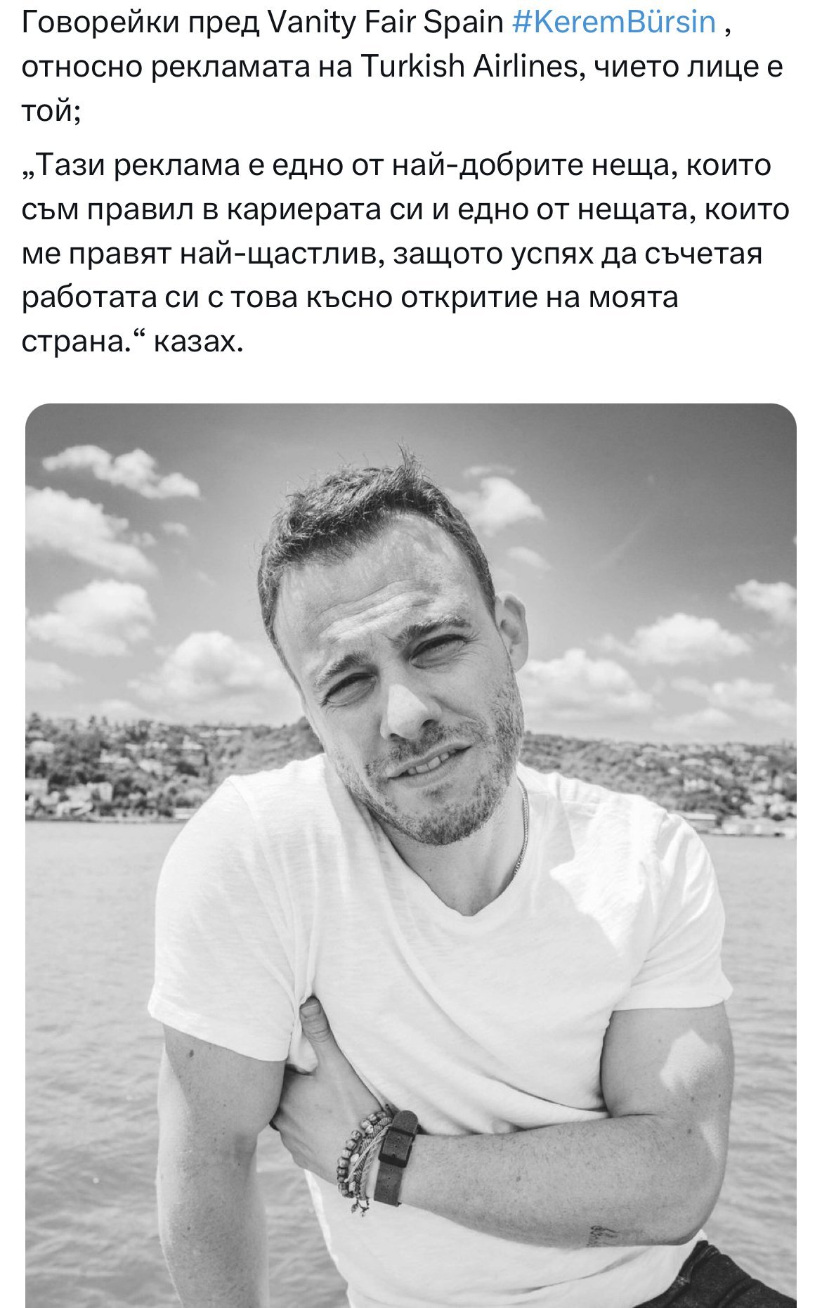 Самоироничен, все още опознаващ и преоткриващ корените си, земен, не забравил началото, работил за постигане на целите си, малко изненадан от известността, но не и заслепен и главозамаян, космополит, със широко отворени очи и сърце за света, в който живее с всчките му проблеми, нужди, странности и красоти, с планове и мечти за кариерата си, турски актьор, станал известен извън страната си с проектите си, гордеещ се с историята, културата на страната си и правещ необходимото и други да видят и разберат това, обичащ родният си град и родината си.
