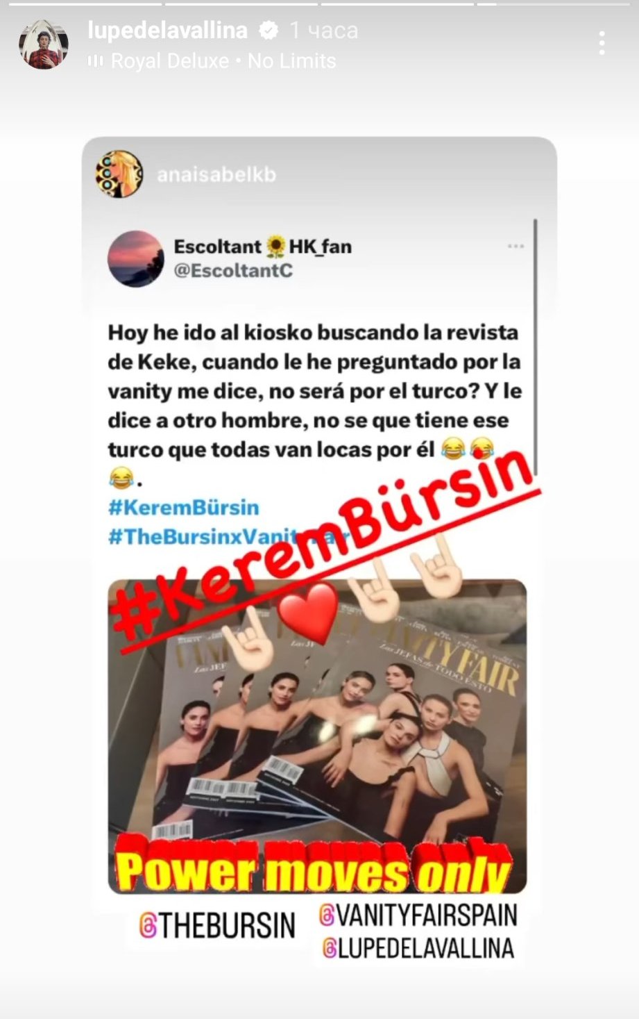 Тони Гарсия, интервюираща Керем в септемврийския брой на VF, е работила за повече от сто медии в над 6 държави. От друга страна Лупе, фотографът е на свободна практика, който е снимал много известни и испански артисти и политици #TheBursinxVanityFair