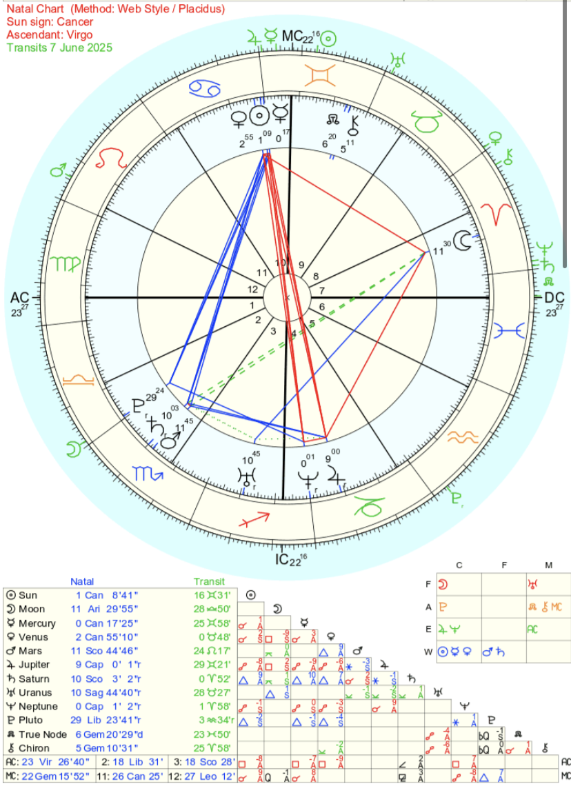 Бих искала и аз да попитам нещо на тема елекция. С годеника ми планираме да сключим брак през лятото на 2025г.  Наскоро реших да погледна за възможни дати и ми направиха впечатление транзитите в неговата карта. Транзитни Сатурн и Нептун ще квадратират натален Нептун през цялото лято, като в началото на лятото и Юпитер ще се присъедини към тях в Т-квадратура. До края на лятото само опозицията на Юпитер към Нептун ще се разпадне. Въпросът ми е: според вас по-добрият вариант ли е да се избегне Т-квадратурата с участието на Юпитер или има ползи от него, заради съвпада му със стелиума в рак?