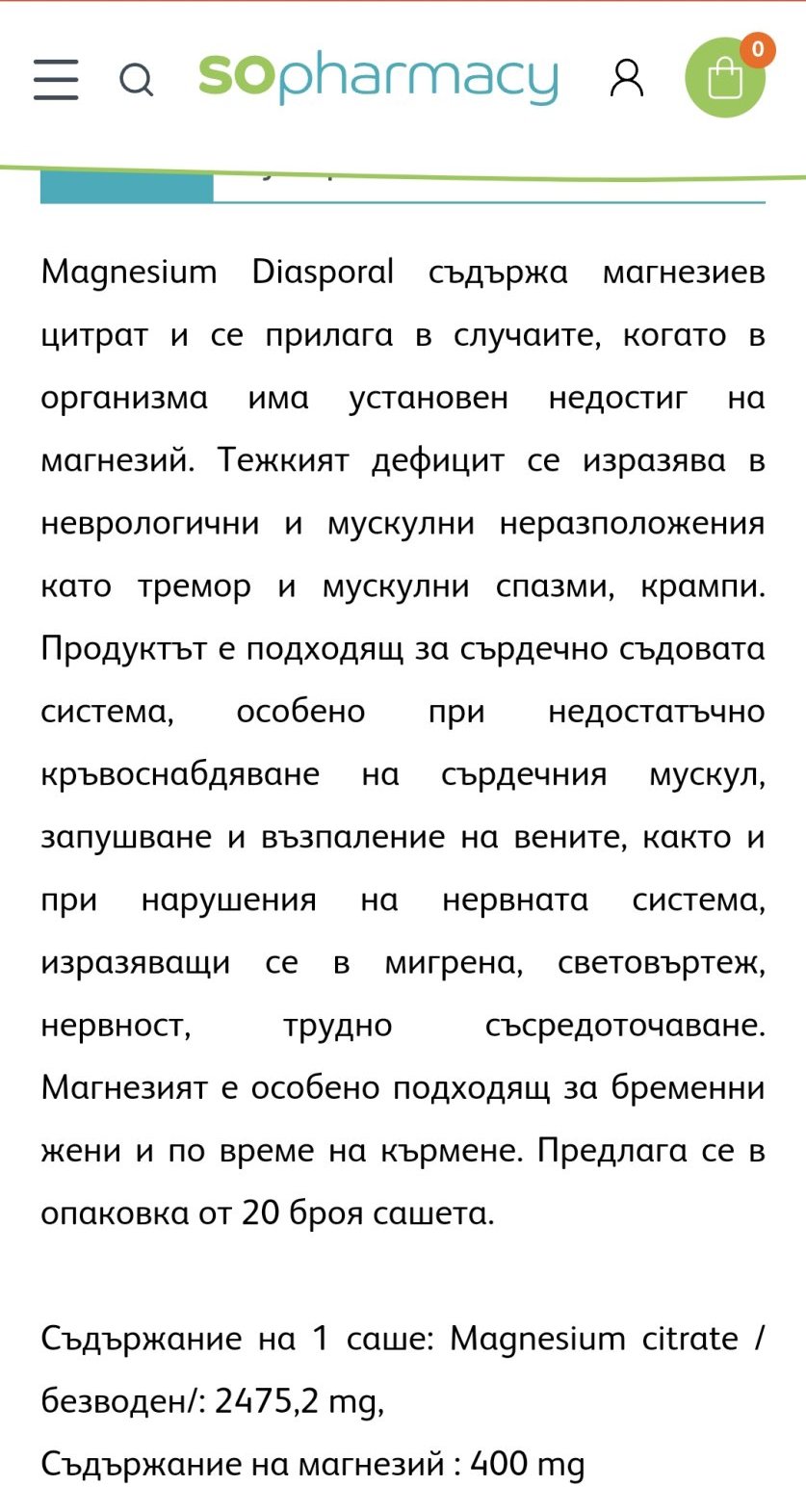 По отношение на магнезия да се включа с приятна новина. От вчера взимам прахчетата диаспорал 400 мг и мога да ви кажа че веднага се усеща- нямам крампи, нито ми се стяга корема. Някоя от вас беше споделила мисля, че разхлабва, но при мен го няма този страничен ефект. Моята АГ ми го беше препоръчала, но и аз защо ли не го взех по-рано не знам. Факт обаче, че не бих се върнала към магнерот дори да го пуснат, а за магнерич да не говорим. Пиех 3*1 и от него и постоянно имах крампи.