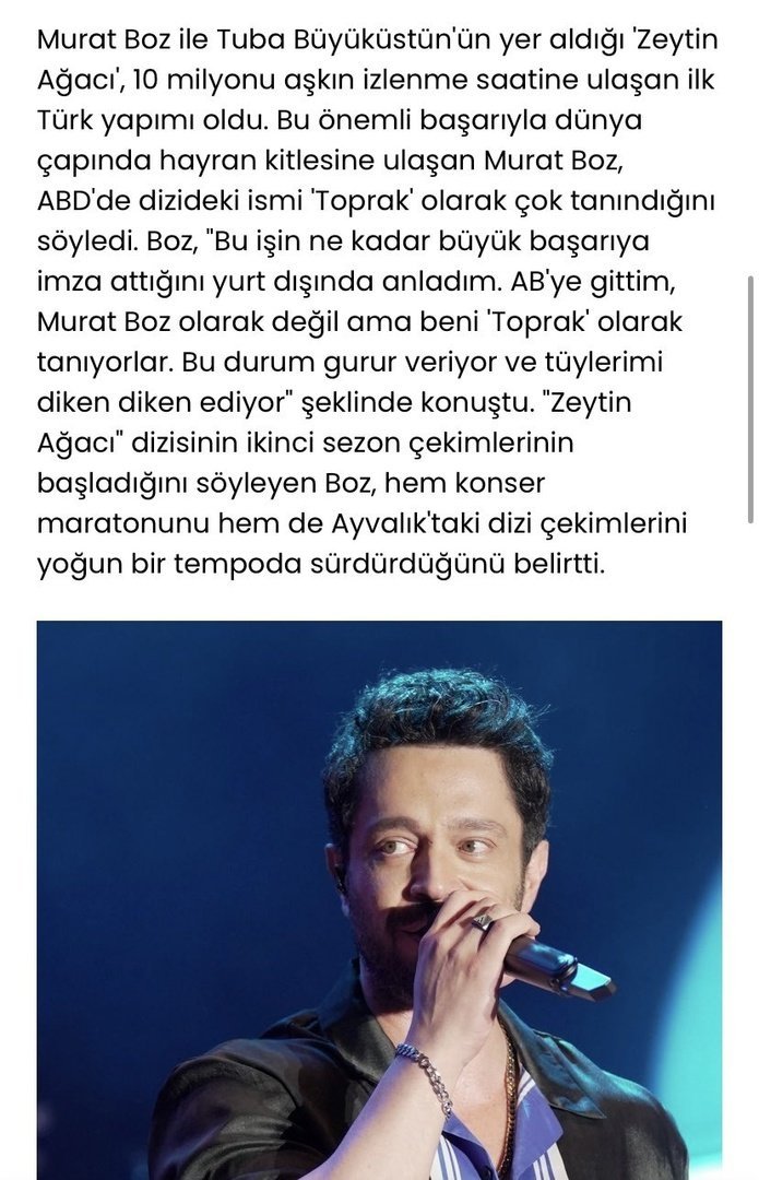 Боз каза: "Колко голяма е тази работа за мен, разбрах, когато подписах договор в чужбина. Отидох в САЩ, не като Мурат Боз, а като "Топрак" в Америка, известен съм като героя на сериала - Топрак. Това обстоятелство е много ласкателно за мен и ме вдъхновява. Кара ме да настръхвам", каза той.