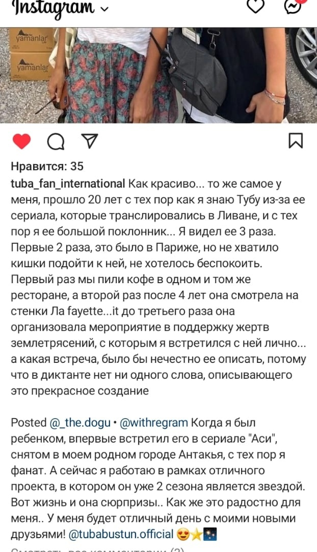 Надпис на сн: Когато бях малък  я срещнах за първи път в телевизионния сериал Asi, заснет в родния ми град Антакия, и оттогава съм й фен. Сега работя като част от един прекрасен проект, в който тя участва вече два сезона. Ето го животът и неговите изненади.. Колко съм щастлив... @tubabustun.official