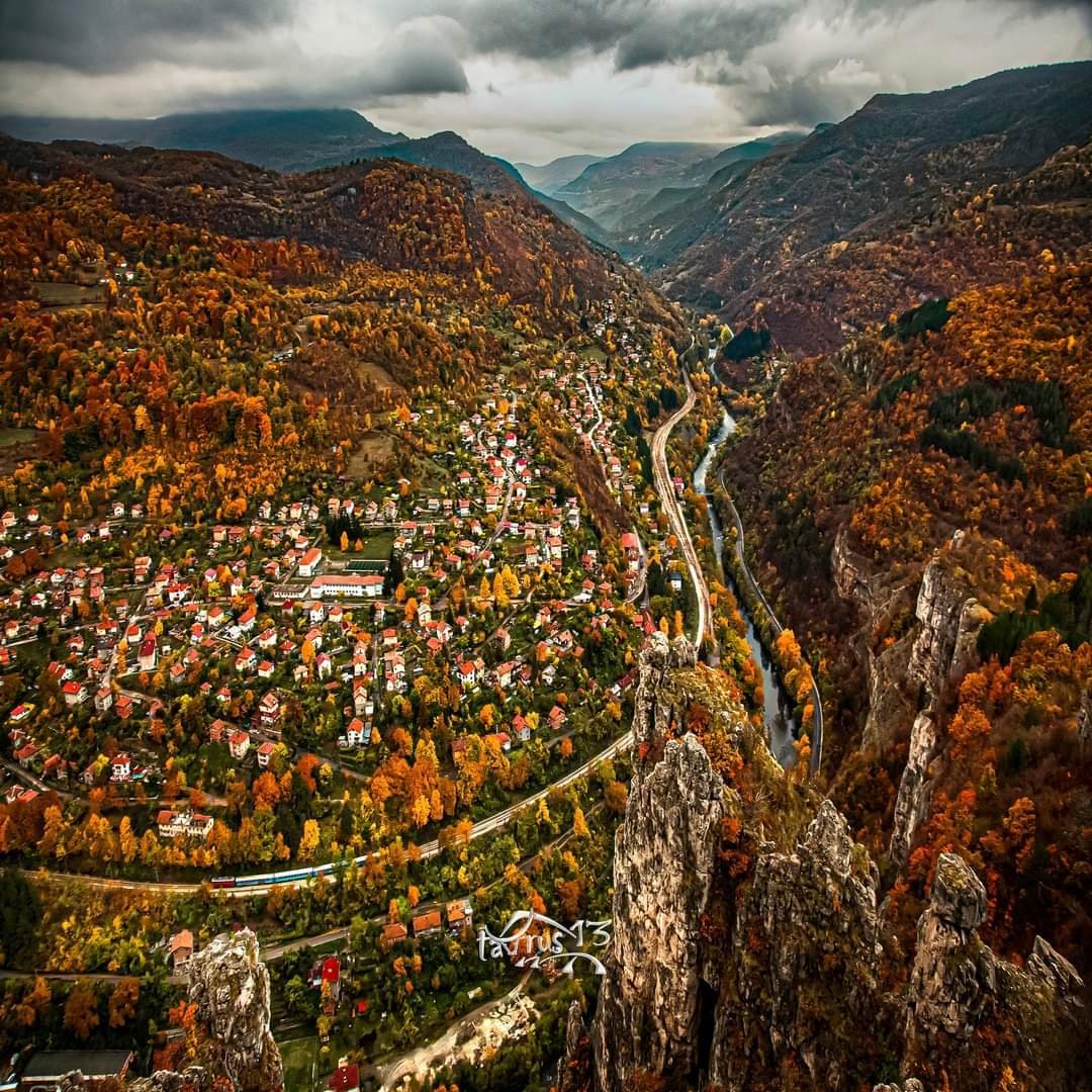 Преминаващ влак през Искърското дефиле или есен на Лакатнишките скали.