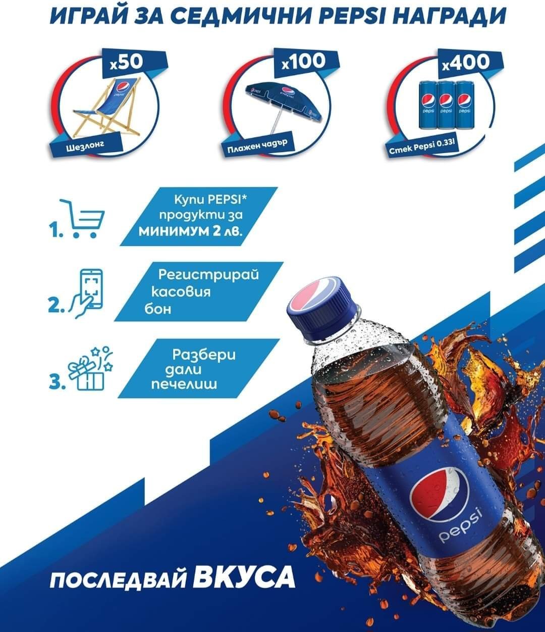 Купи продукти Pepsi за минимум 2лв. , регистрирай касовата бележка и участвай в Седмичните тегления за: